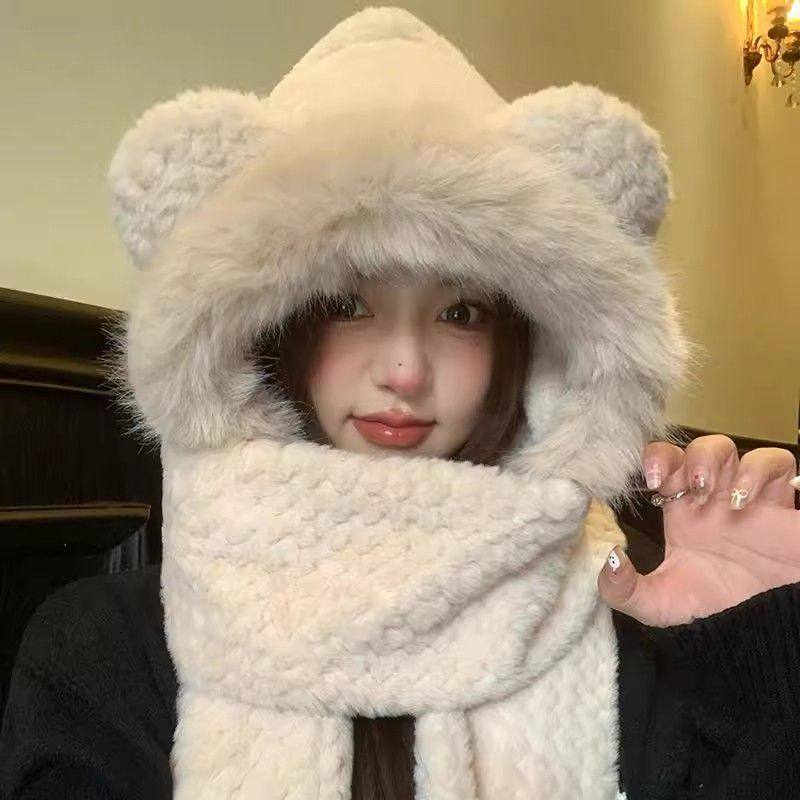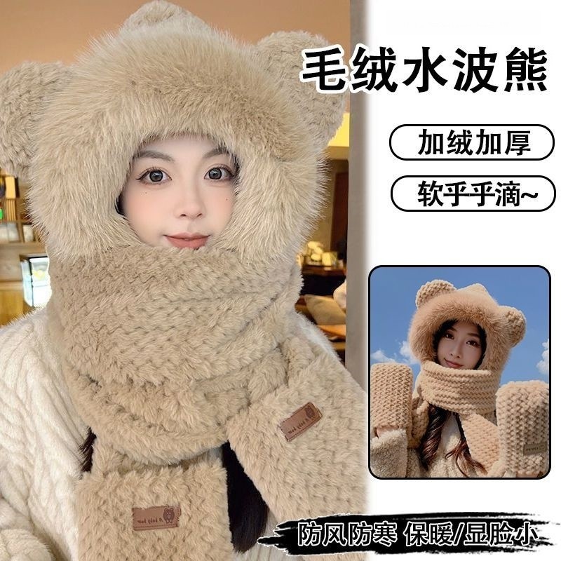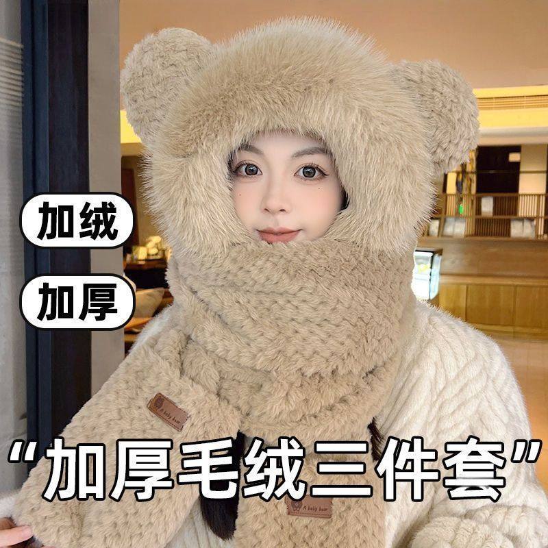 2025冬季新款女生可爱小熊帽子手套围巾一体冬天护耳防风面罩围脖