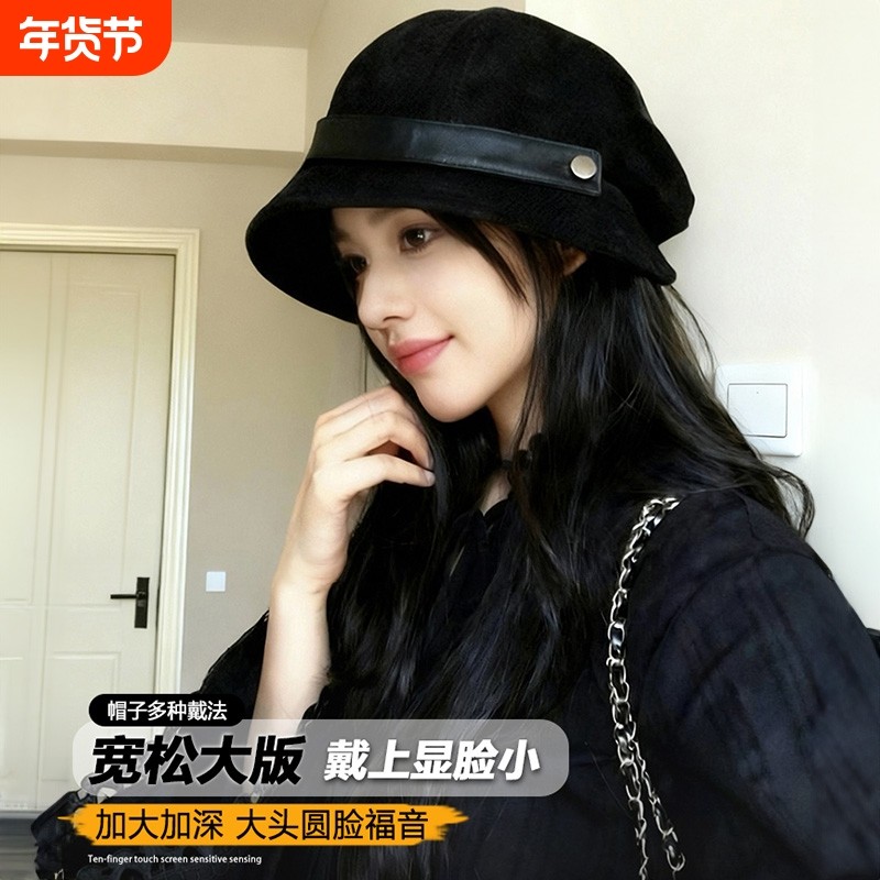 帽子女2025新款秋冬灯芯绒渔夫帽黑色盆帽大头围显脸小贝雷帽圆脸