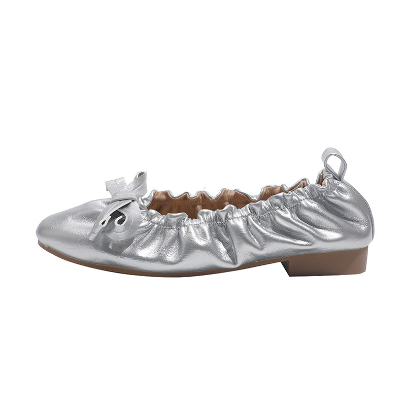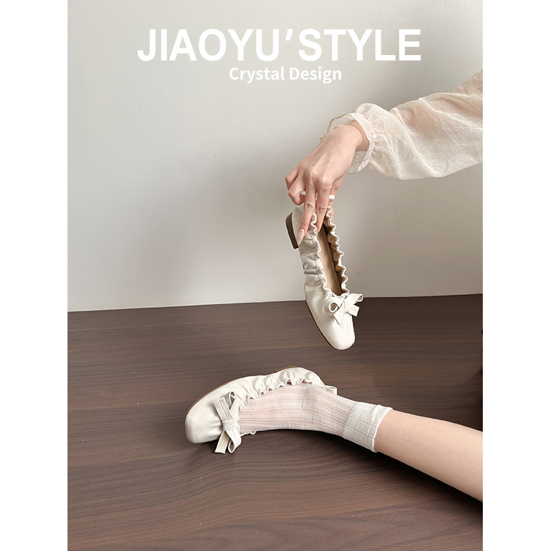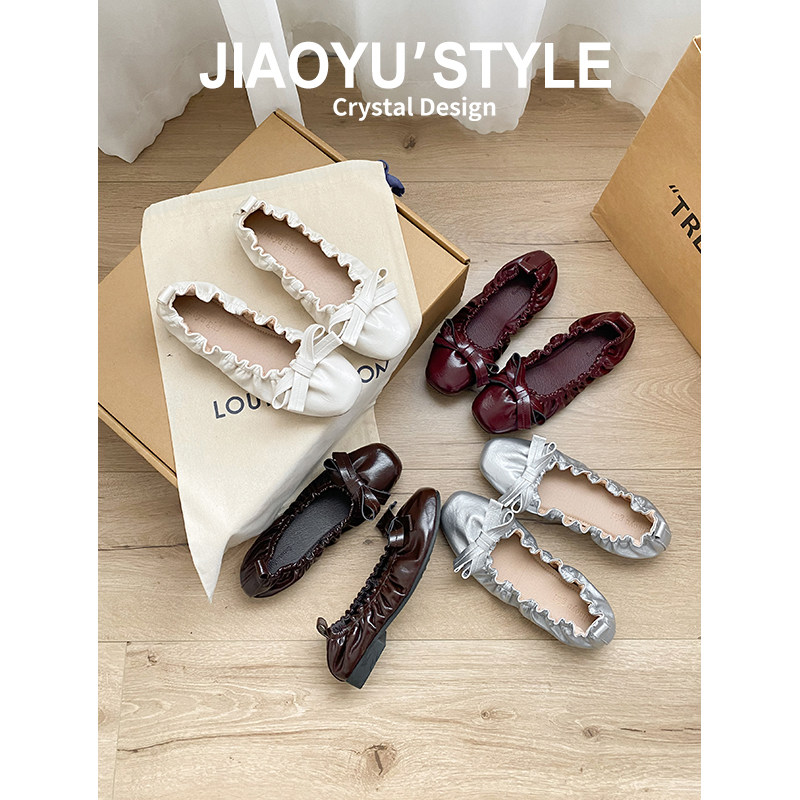 真皮~骄屿复古褶皱蝴蝶结平底芭蕾玛丽珍鞋百搭通勤浅口小红单鞋