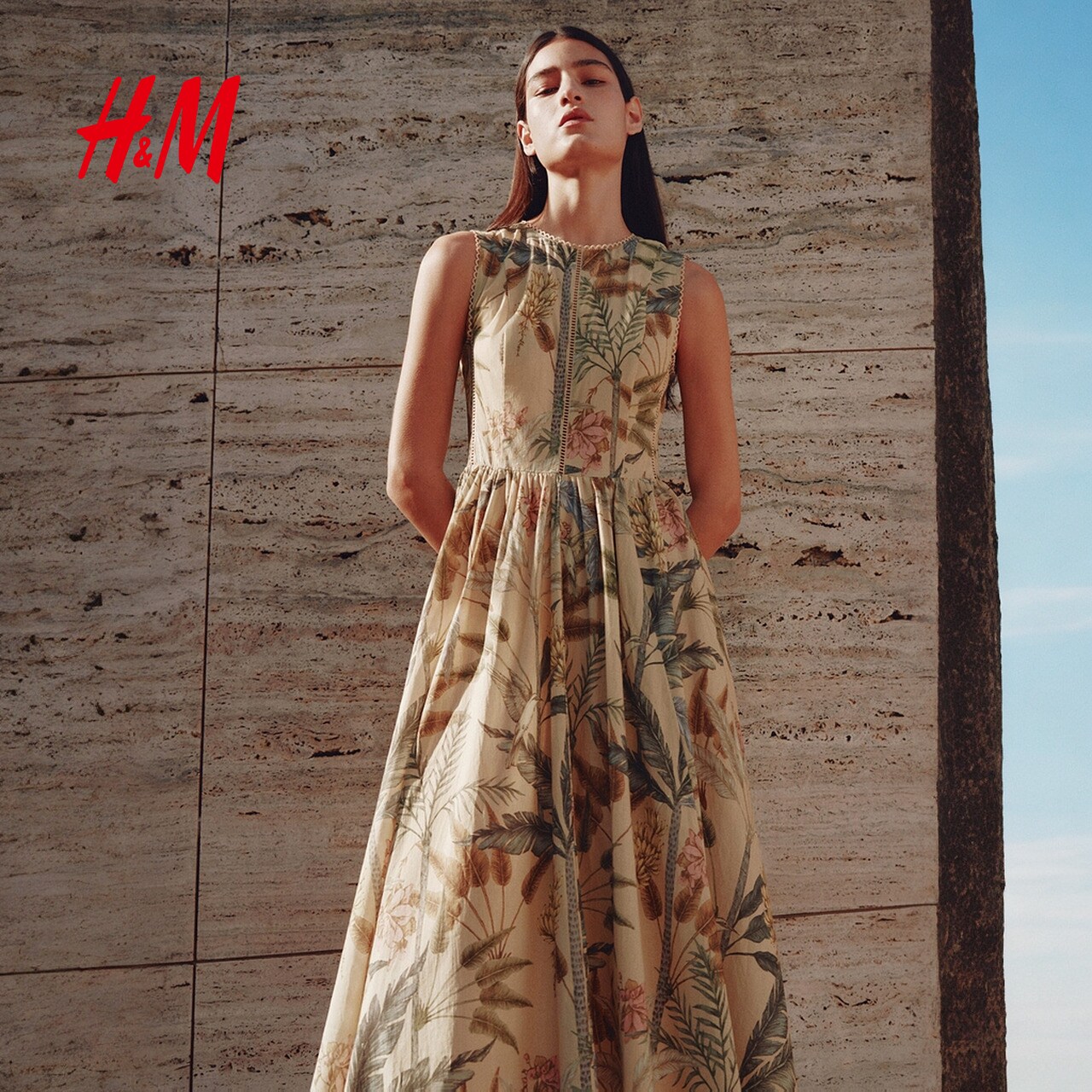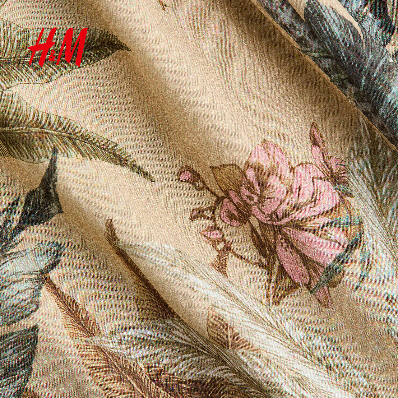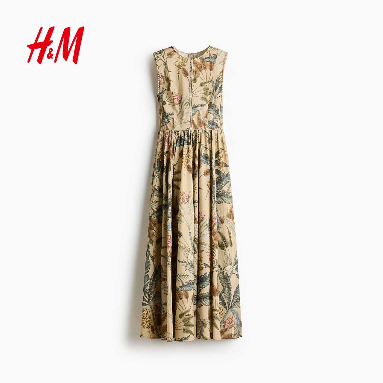 HM女装连衣裙2026春季新款植物印花蕾丝装饰棉质连身裙1329816