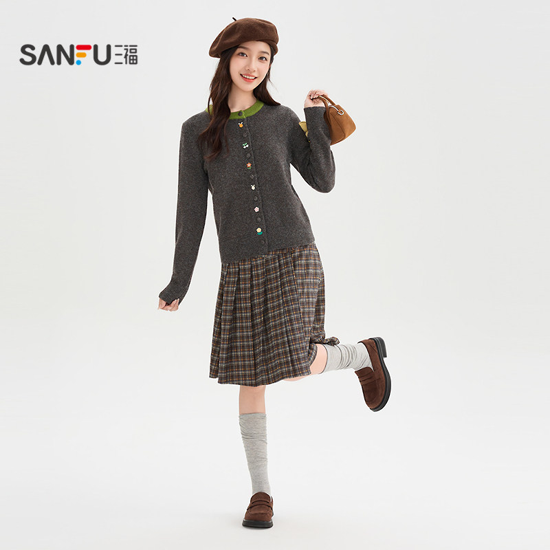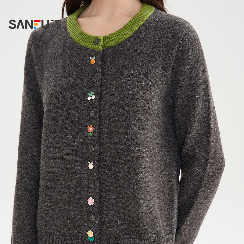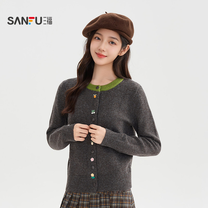 三福毛衣开衫2025新款冬季撞色圆领外套休闲慵懒风上衣女装511808