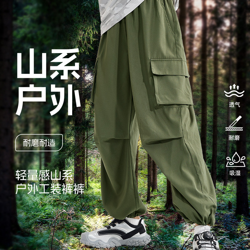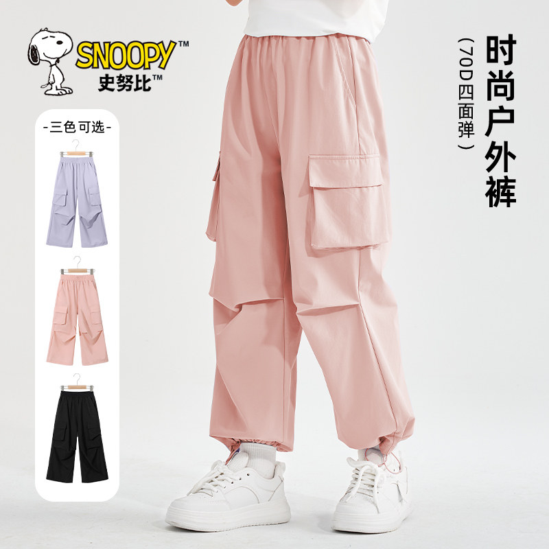 史努比女童工装裤2025新款夏装儿童运动裤女大童紫色户外口袋裤子