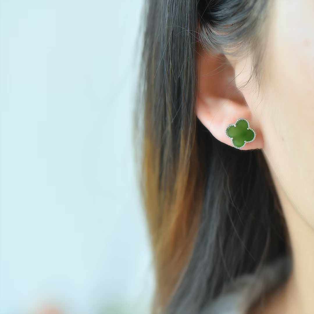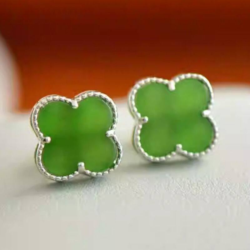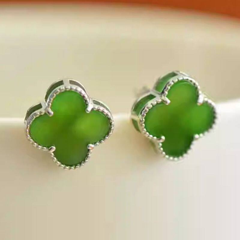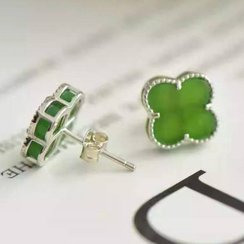 正品和田玉四叶草耳钉女925纯银耳针高档玉石耳饰送女友耳环碧玉