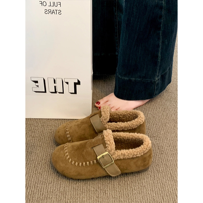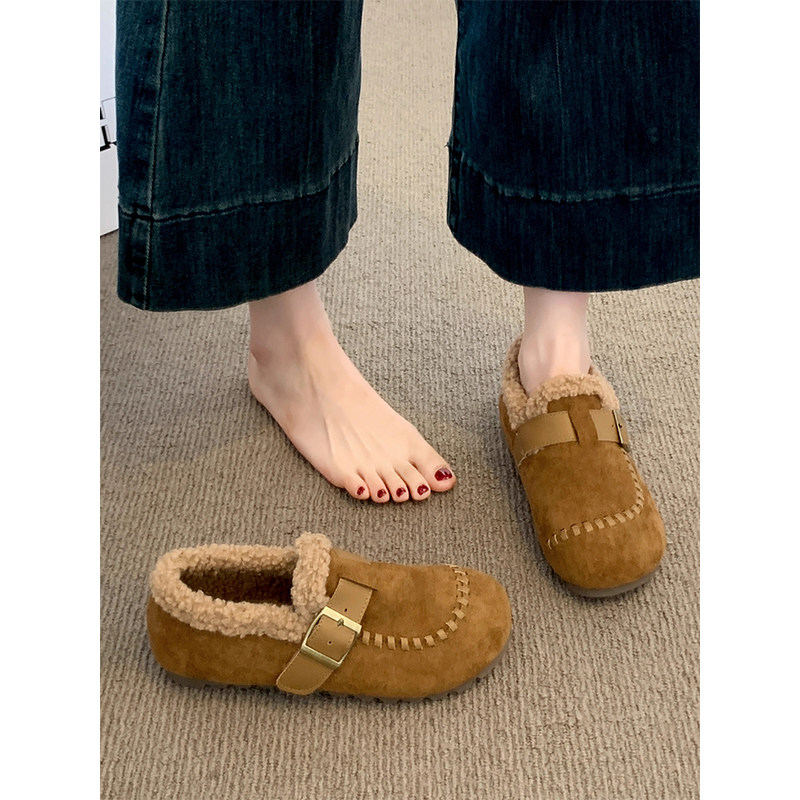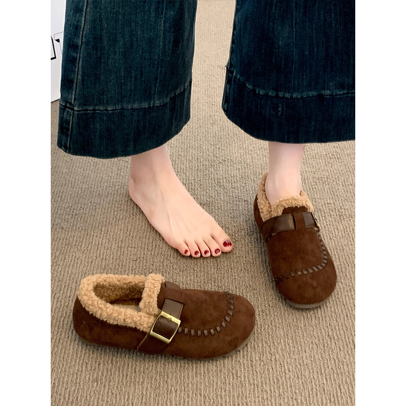 TATAFOCUS~加绒毛毛鞋韩版圆头皮带扣2025冬季新款勃肯鞋女35-28