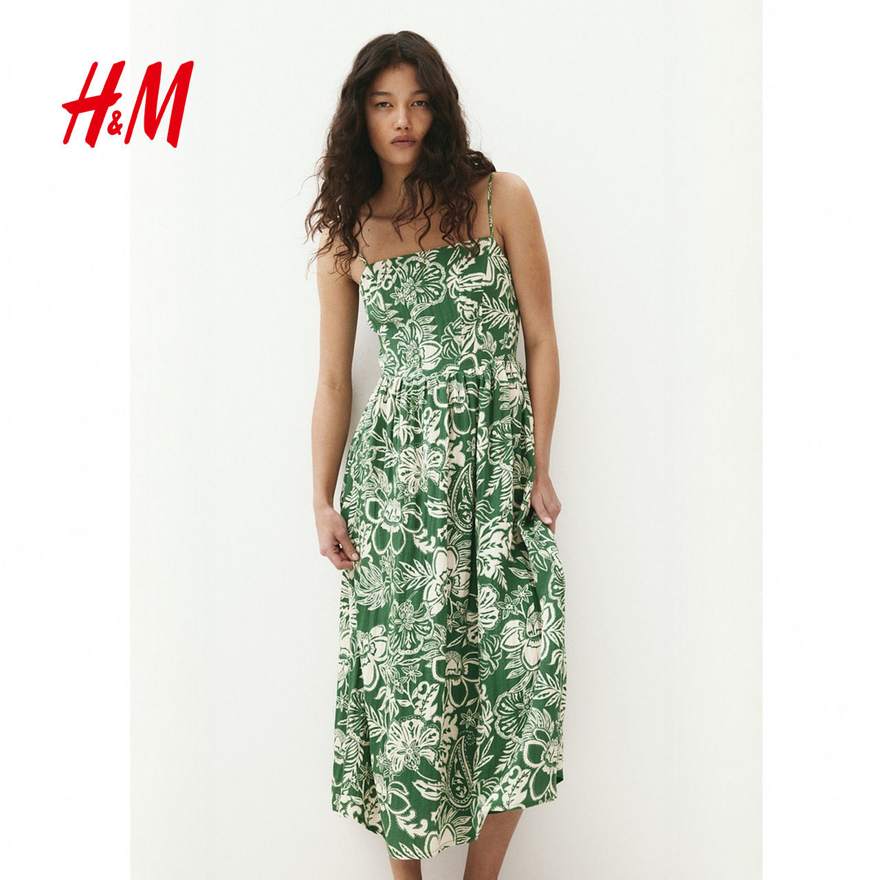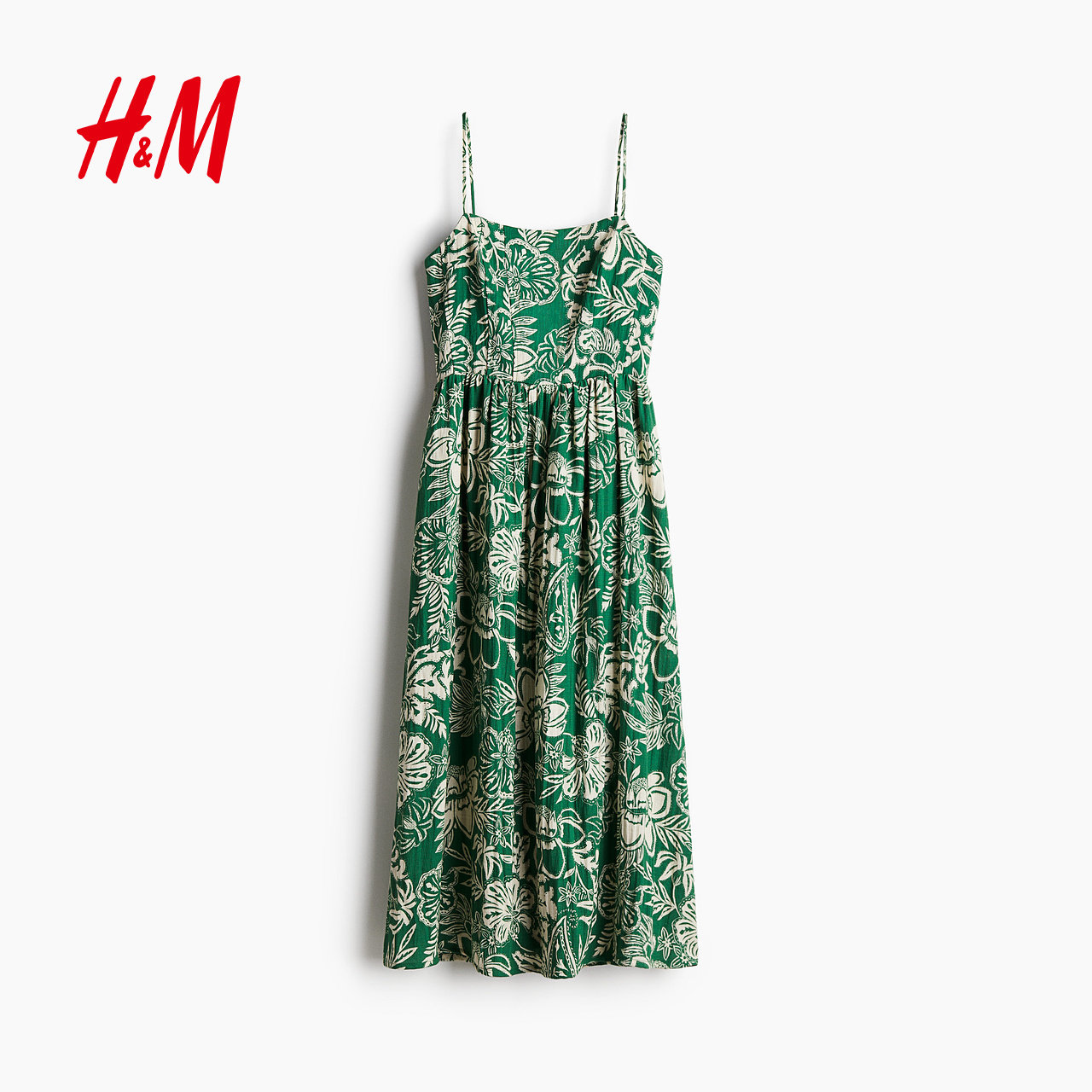 HM女装连衣裙冬度假风印花吊带修身亚麻混纺植物印花长裙1217048