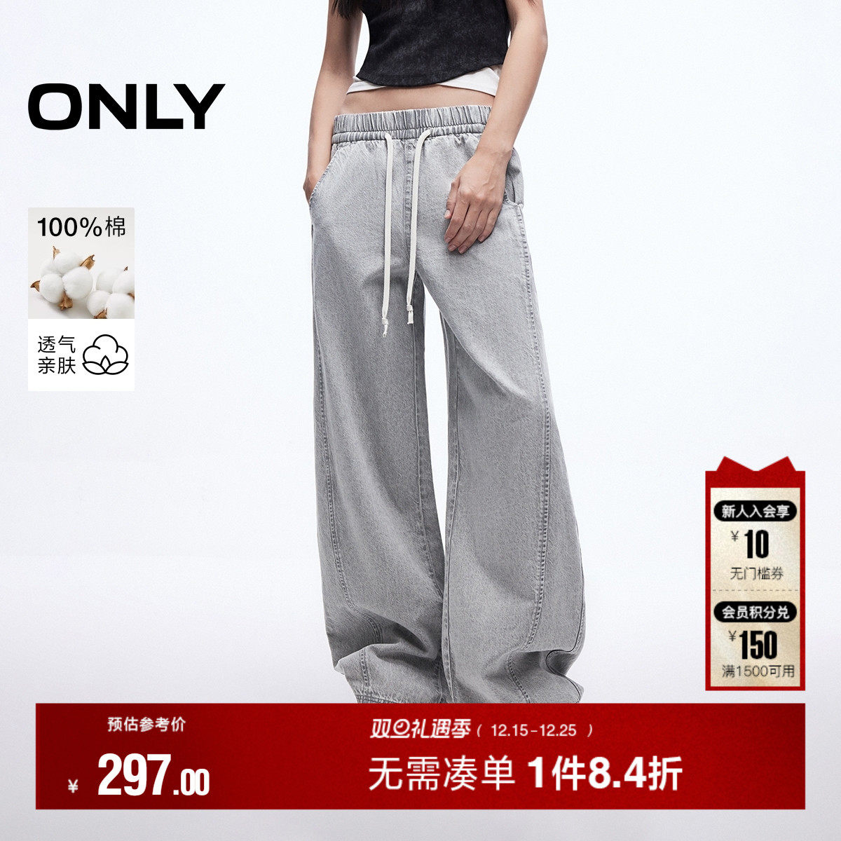 ONLY2025秋季新款舒适弹力抽绳腰头后臀实用大贴袋阔腿裤牛仔裤女
