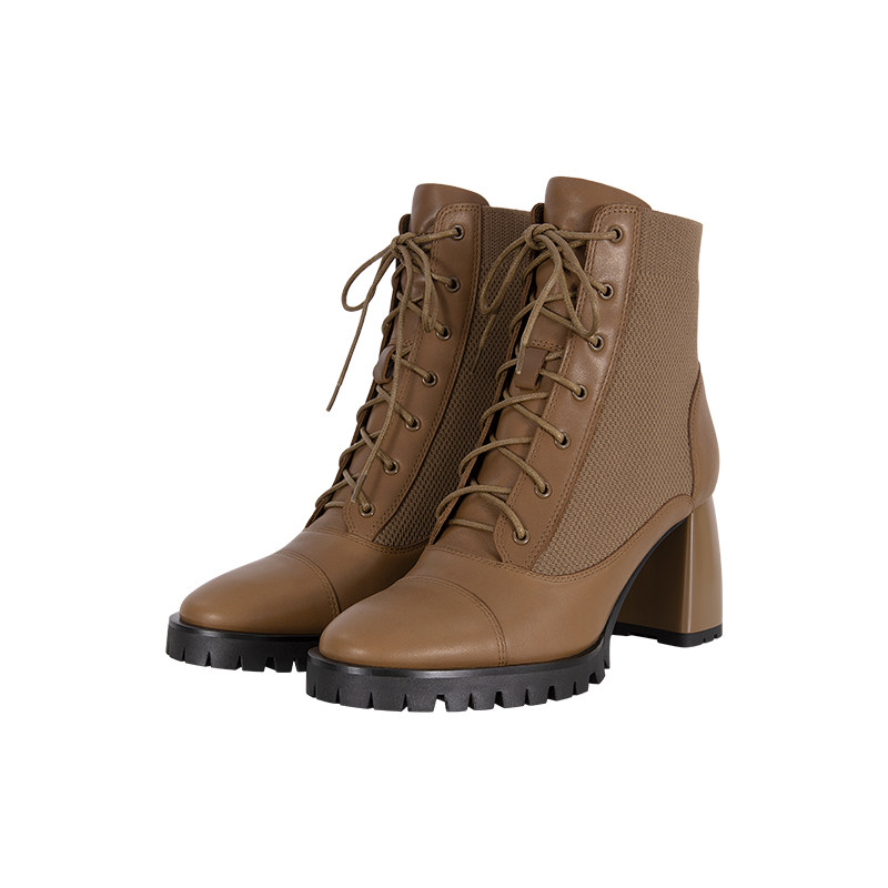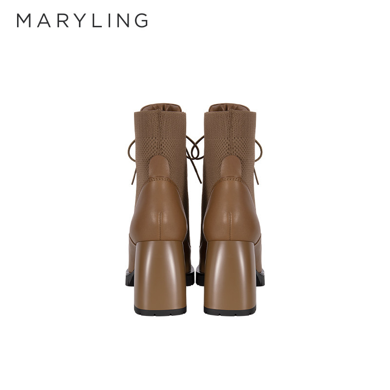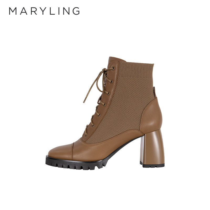 MARYLING玛俪琳秋季新品焦糖色真皮拼接系带短靴A8EFWSB002