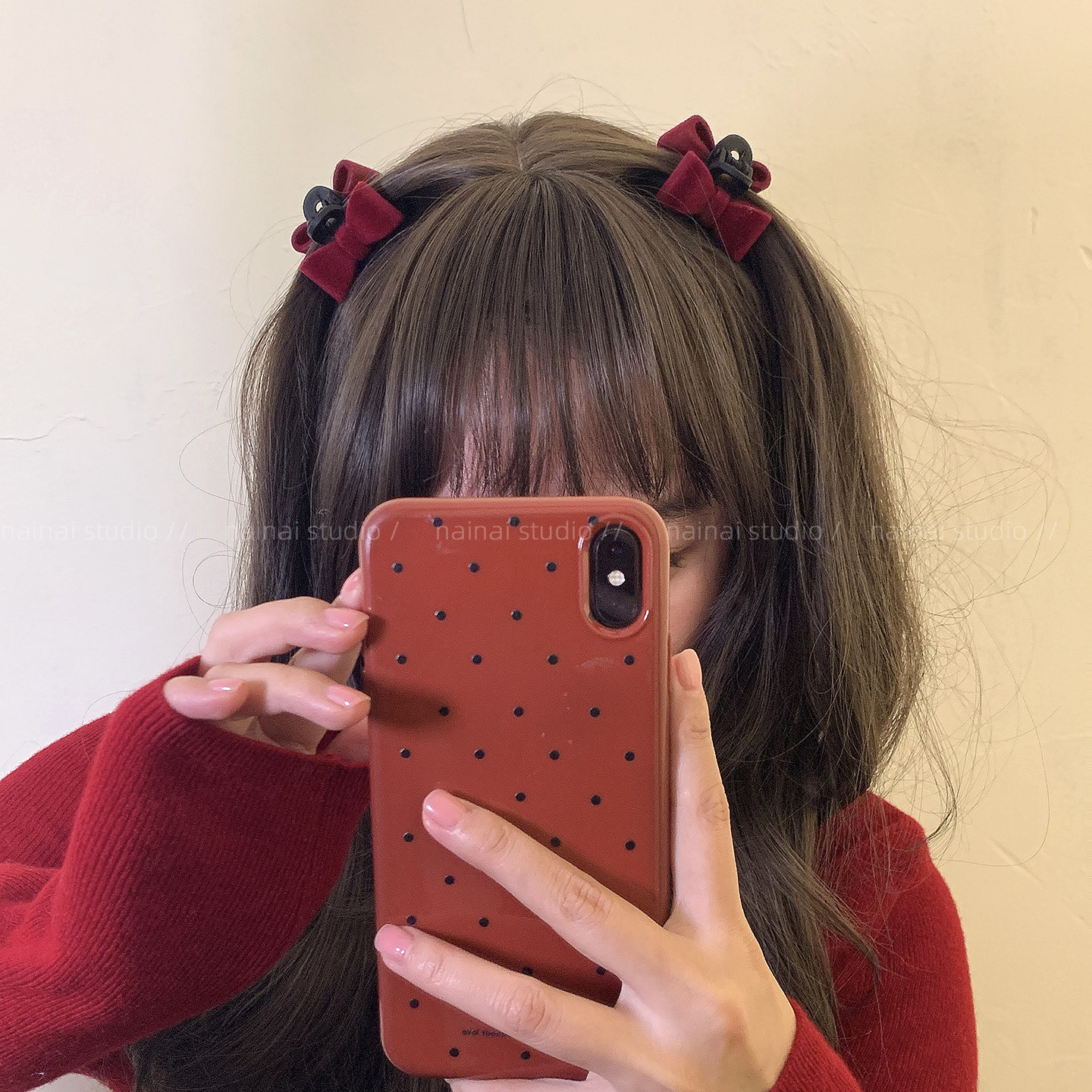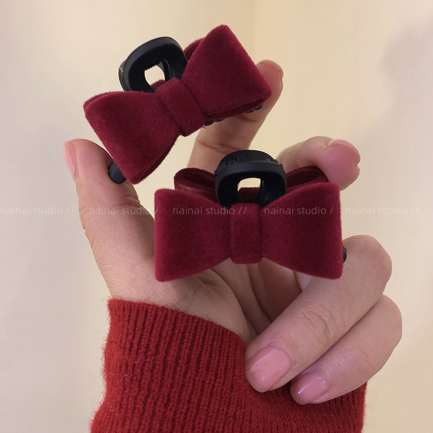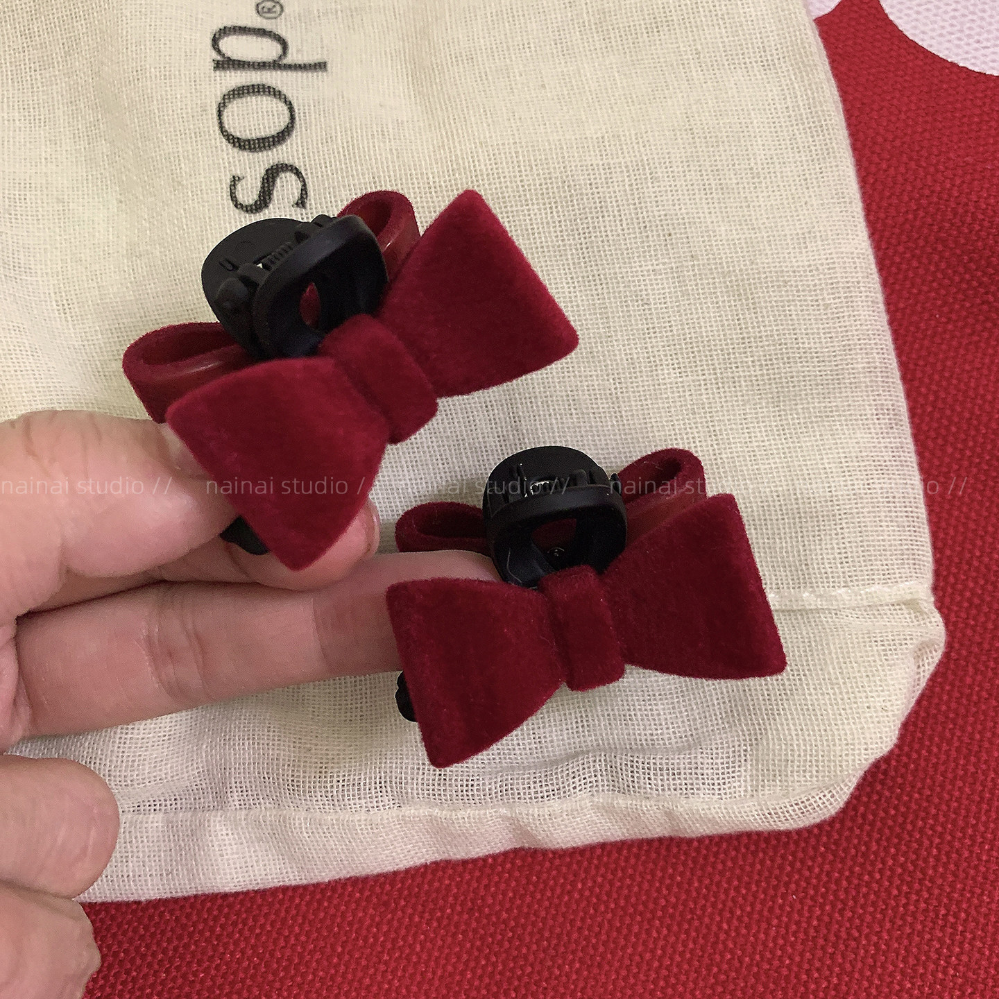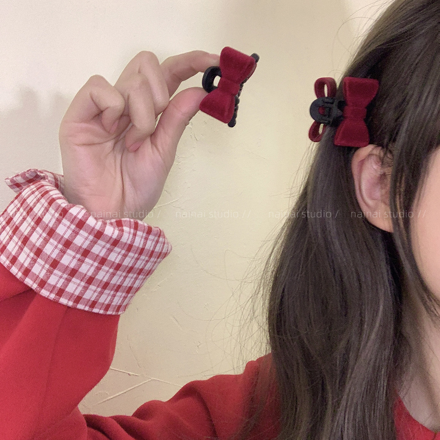 红色蝴蝶结公主头~新年植绒甜美小抓夹侧边夹刘海夹发饰前额头饰