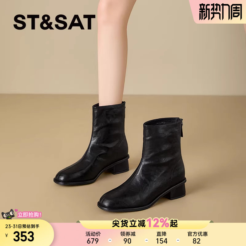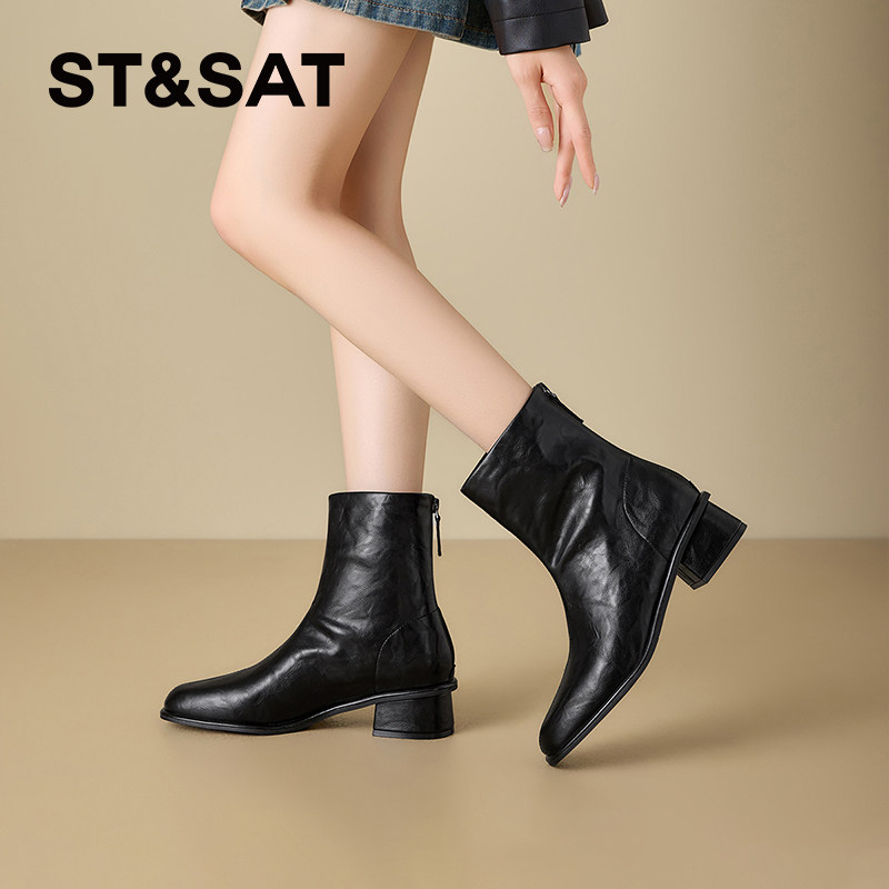 星期六巨舒服复古软皮粗跟中跟短靴女靴子秋冬季新款圆头瘦瘦靴子