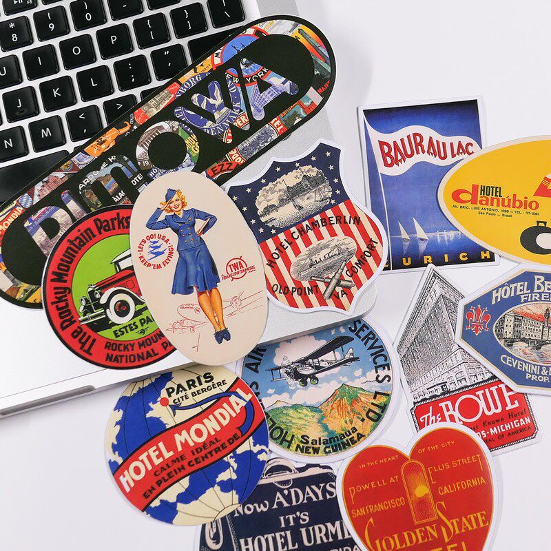 艺贴 12枚欧美复古酒店贴纸日默瓦风贴纸旅行箱拉杆箱贴灰胶防水