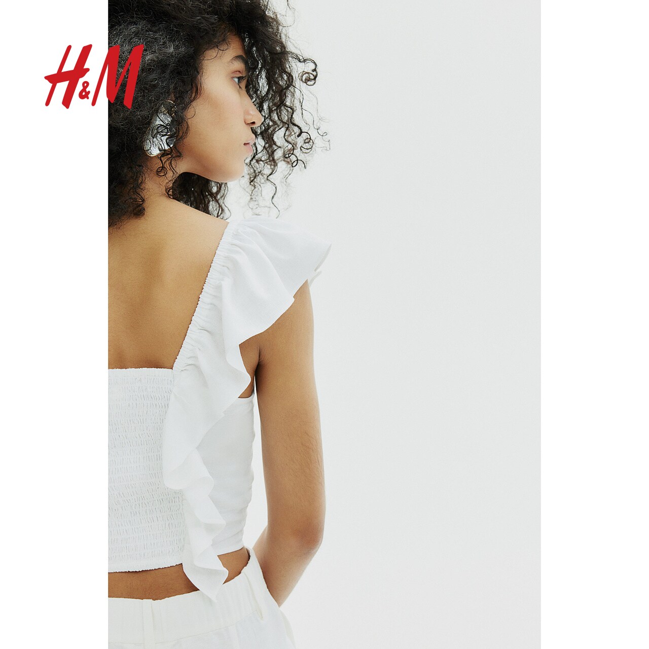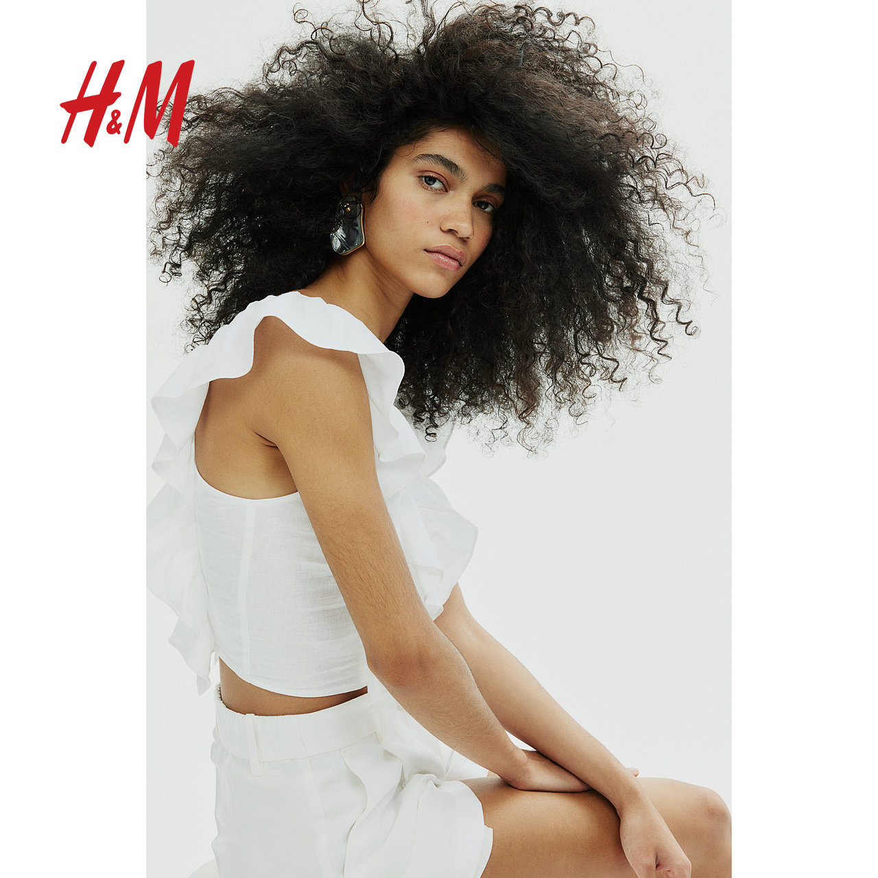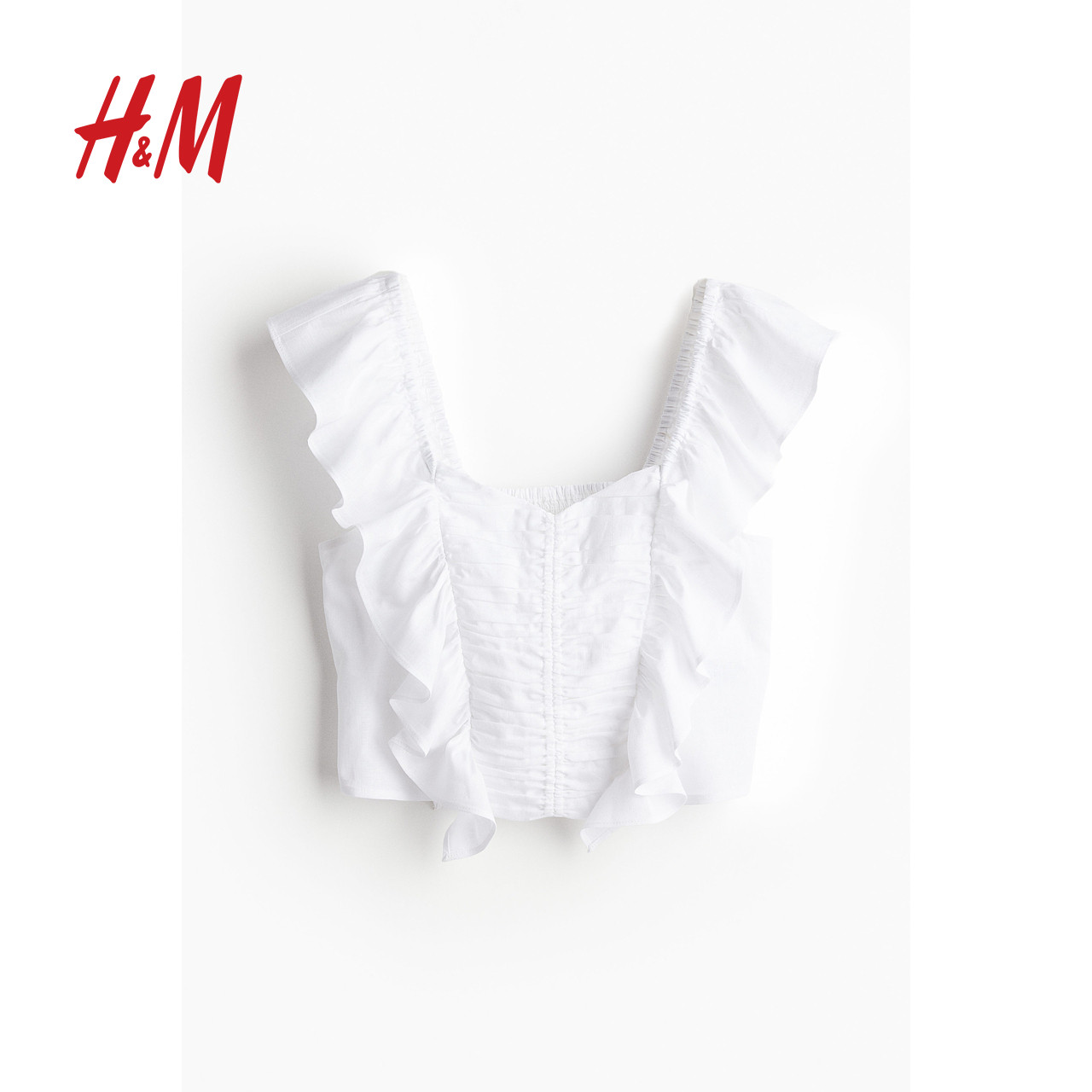HM女装背心吊带春季亚麻混纺宽肩带桃心领春季日短上衣1224824