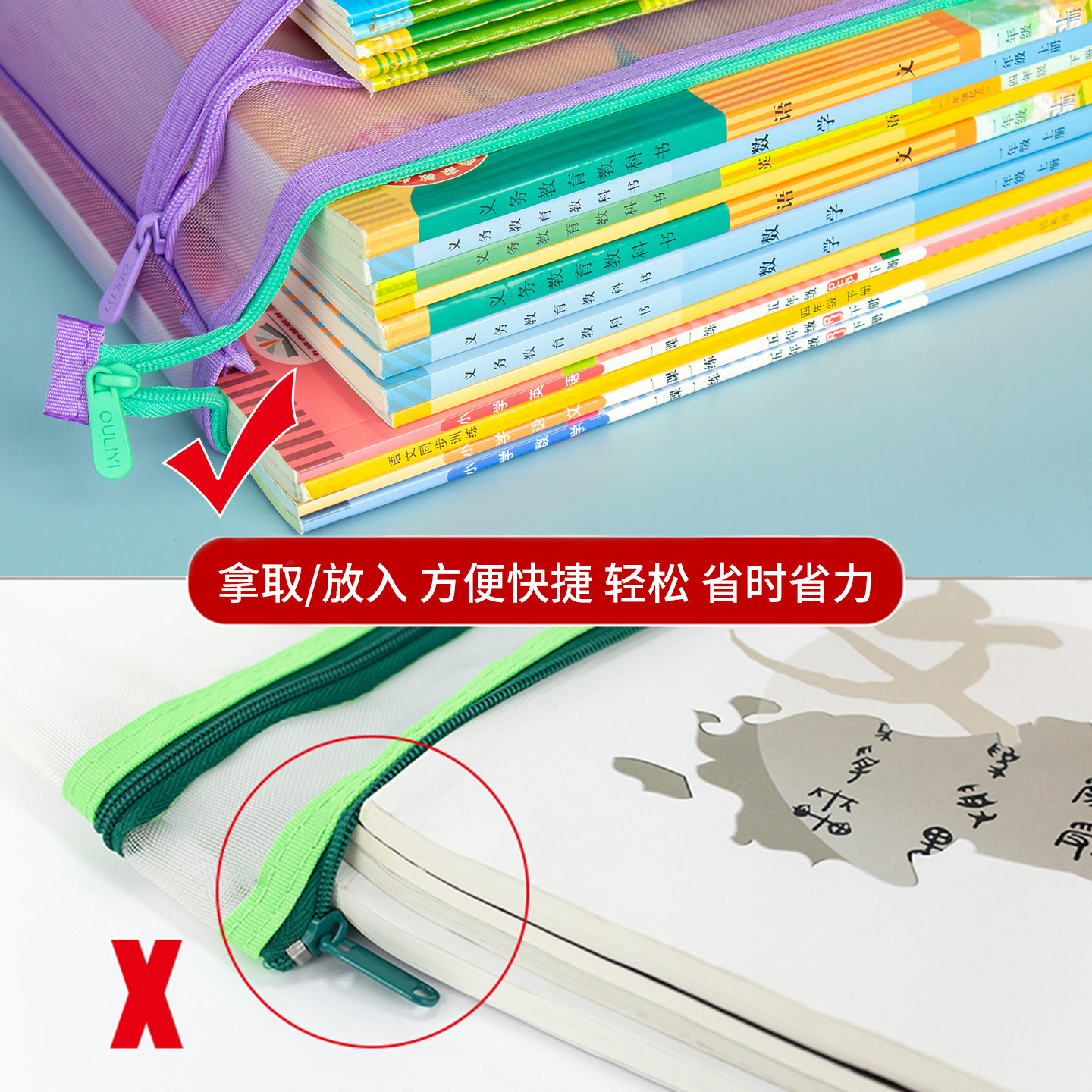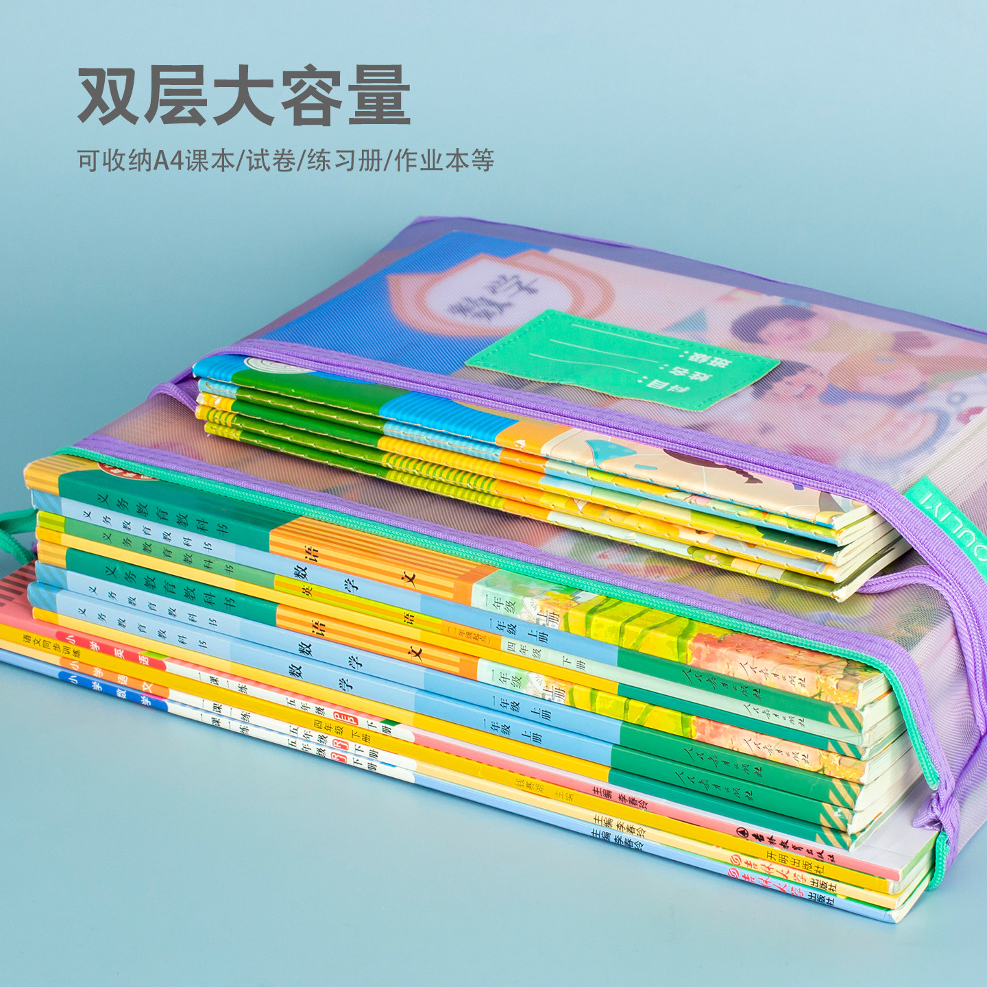 欧力益一年级必备科目分类文件袋拉链透明网纱收纳袋小学生试卷学科A4双层资料袋大容量文具袋学生手提拎书袋