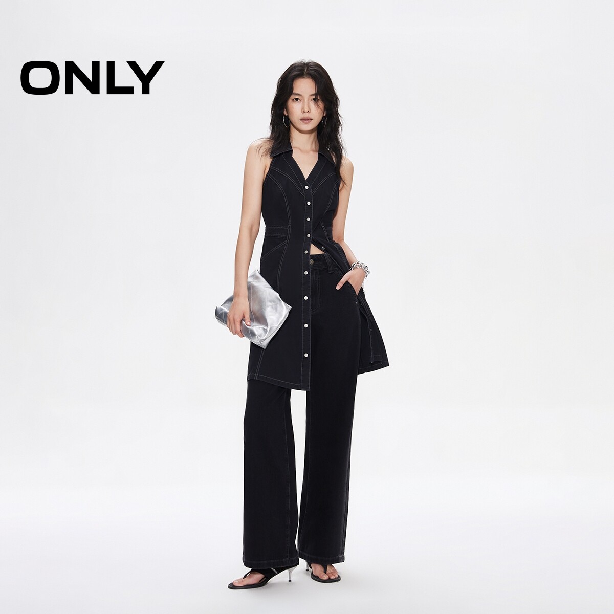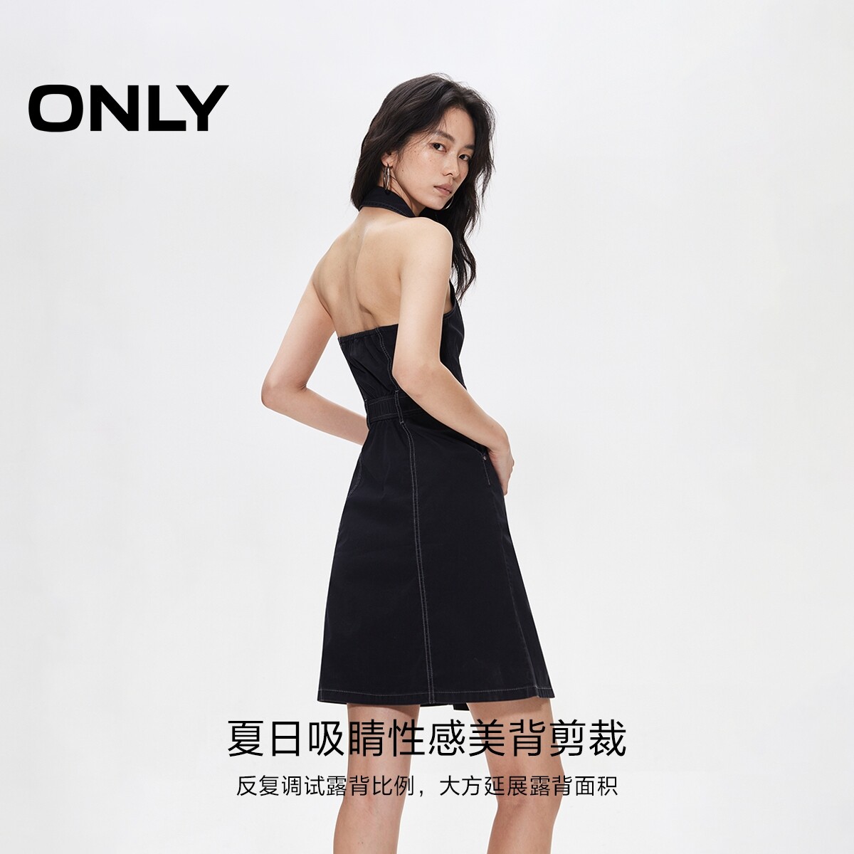 ONLY夏季性感V字翻领挂脖高腰裙子露肩露背短裙牛仔连衣裙女