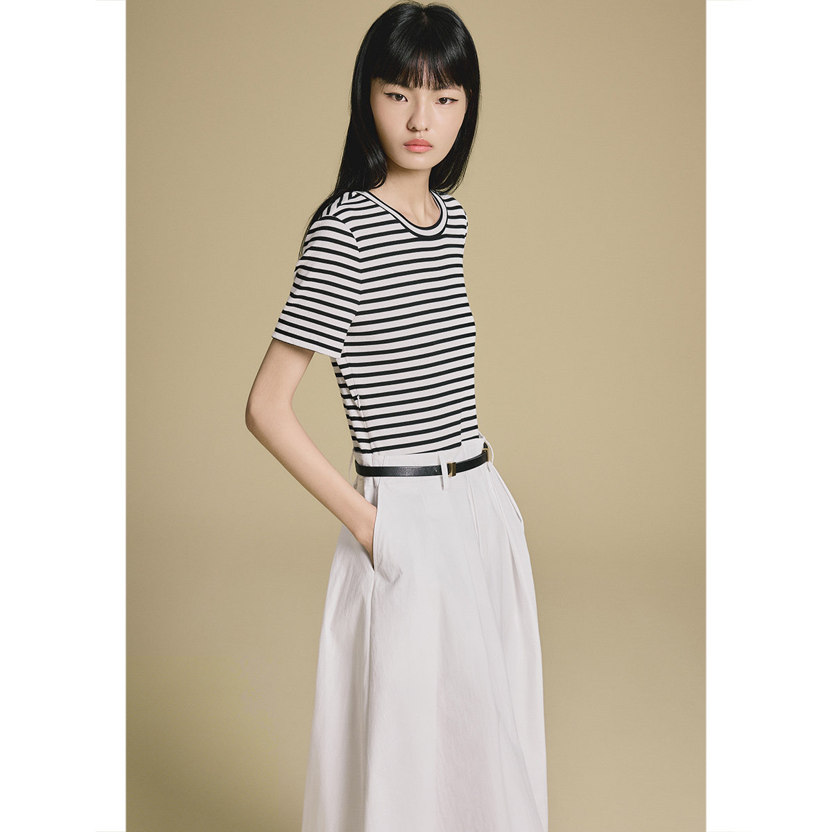 COCOBELLA简约气质黑色收腰极简风连衣裙女优雅短袖长裙FR3033-2