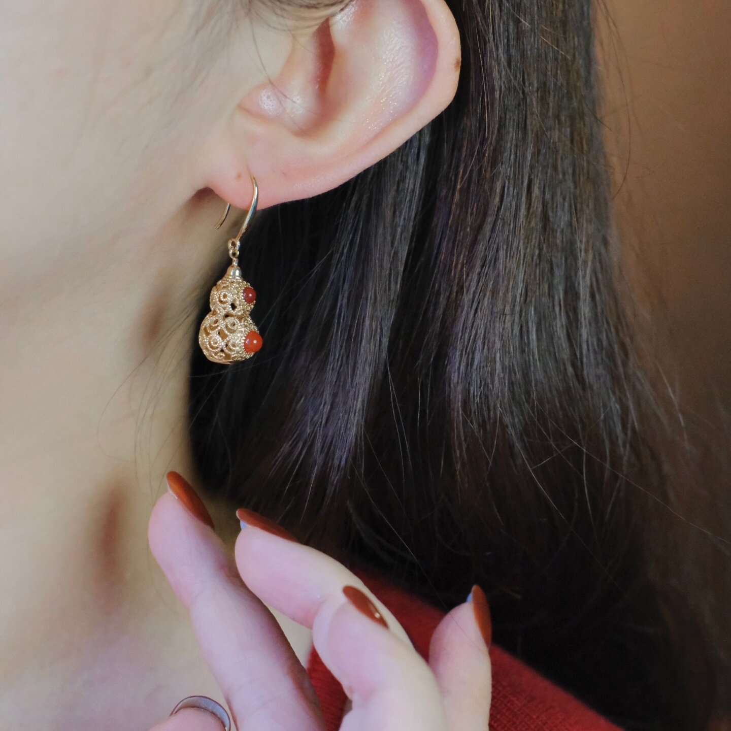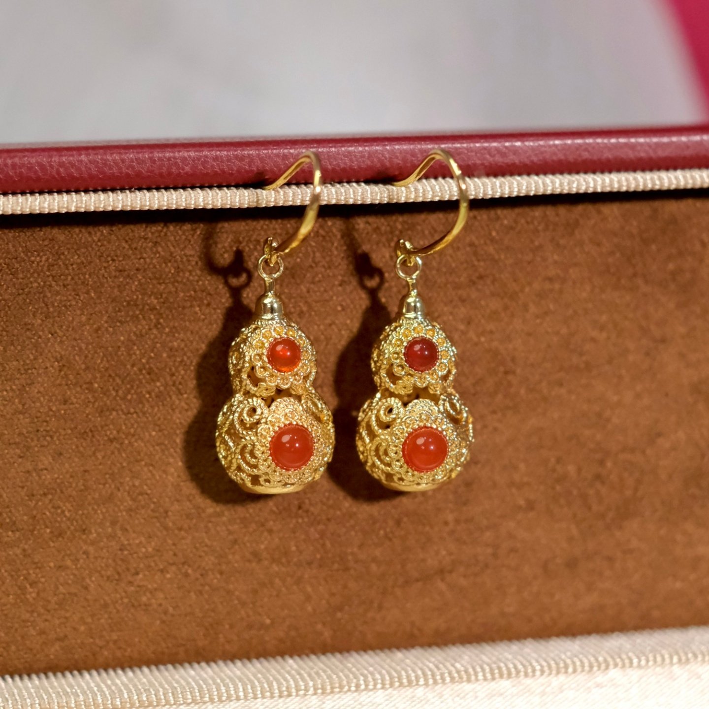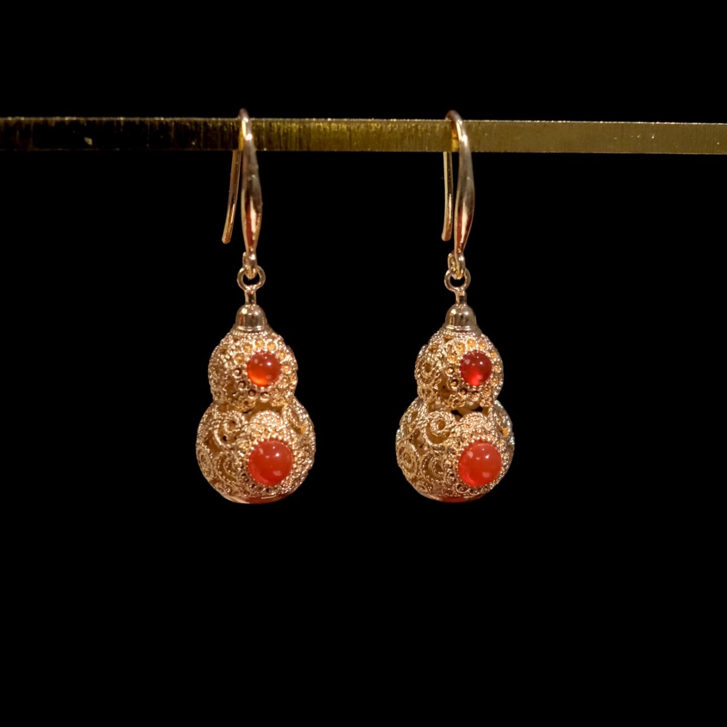 《花丝葫芦》新中式国风新年福禄镂空红色玛瑙耳环耳夹耳饰耳坠女