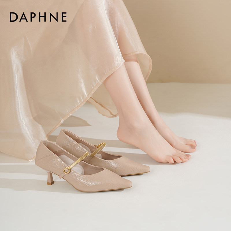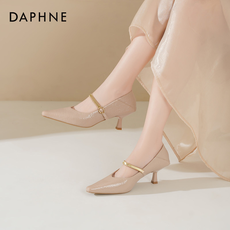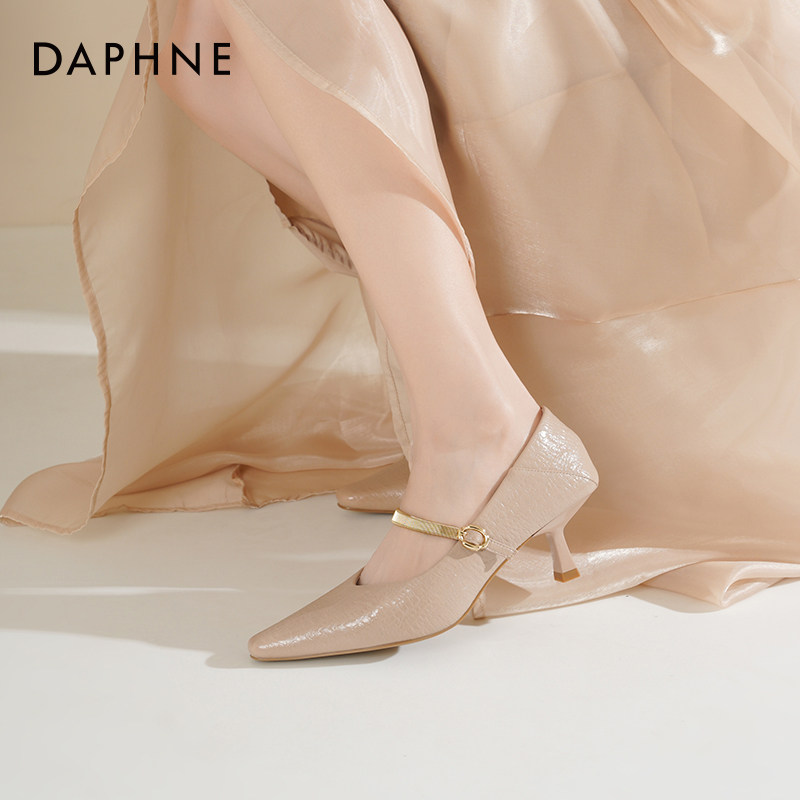 达芙妮裸色高跟鞋女2026新款春季法式一字带通勤女鞋细跟尖头单鞋