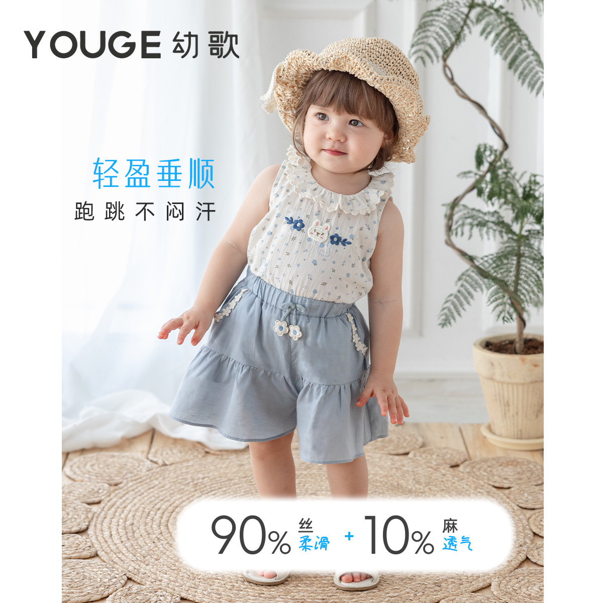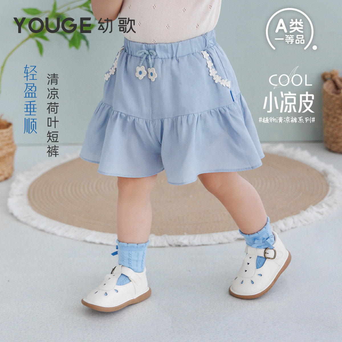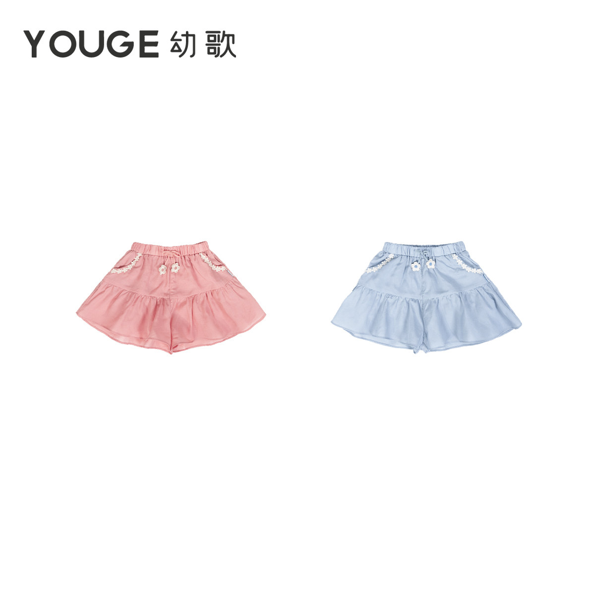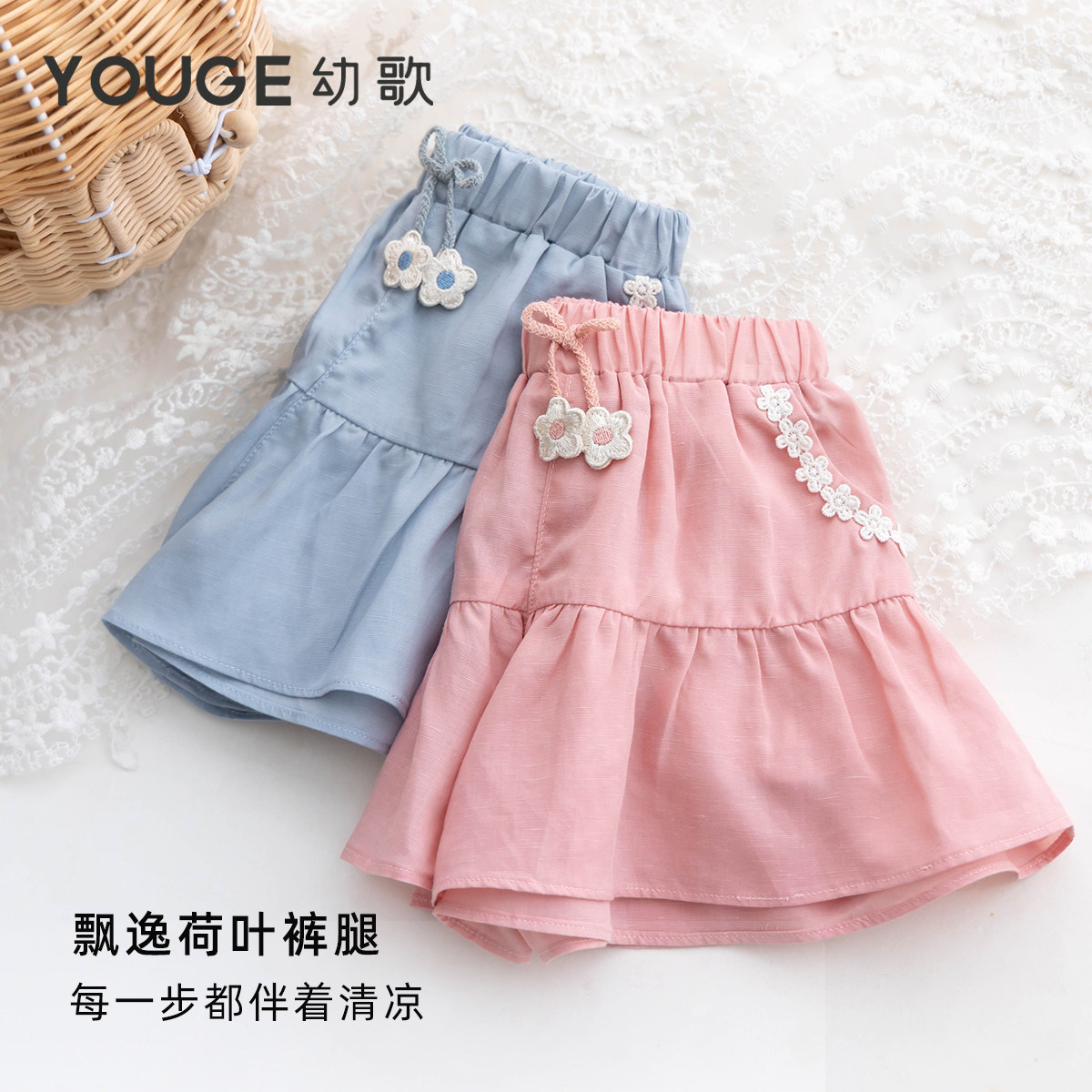 YOUGE幼歌 夏季新款天丝亚麻荷叶边清凉宽松口袋短裤宽松儿童裙裤
