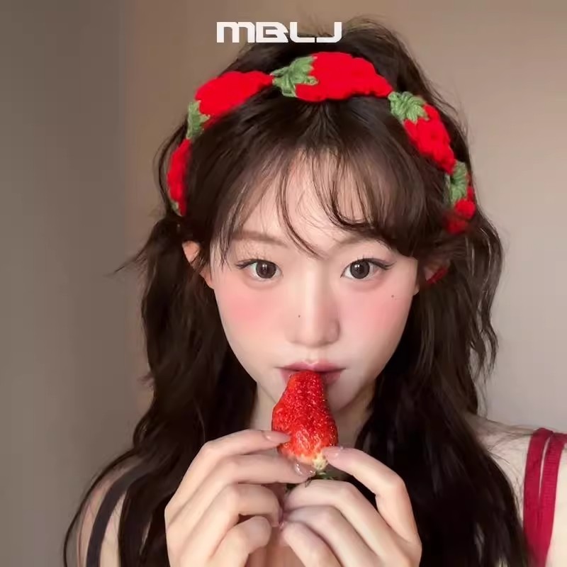甜美可爱风手工DIY编织草莓发带女针织系带发绳日常出游拍照头饰