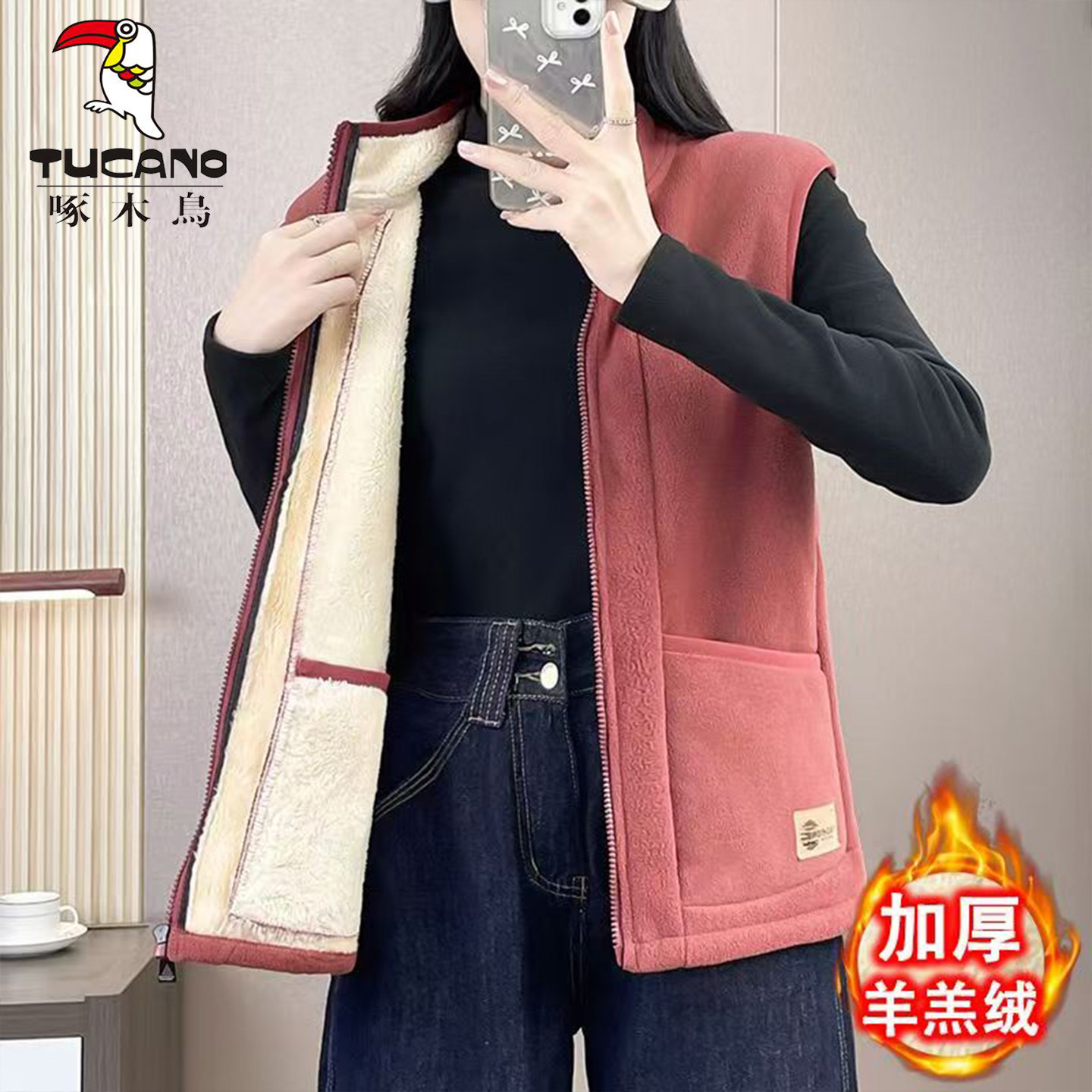 啄木鸟羊羔绒冬季马甲女款外套休闲运动宽松秋冬背心坎肩加绒保暖