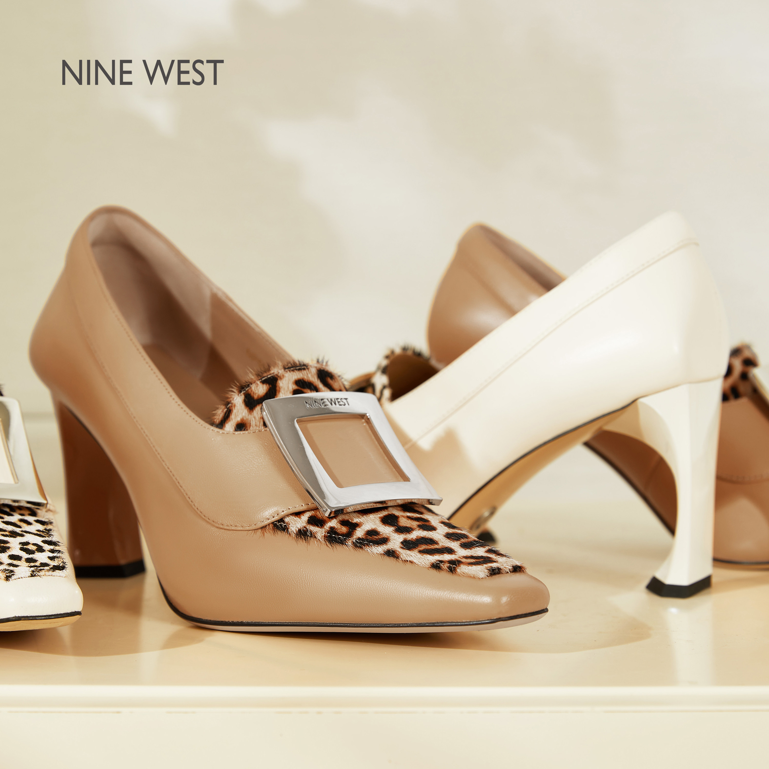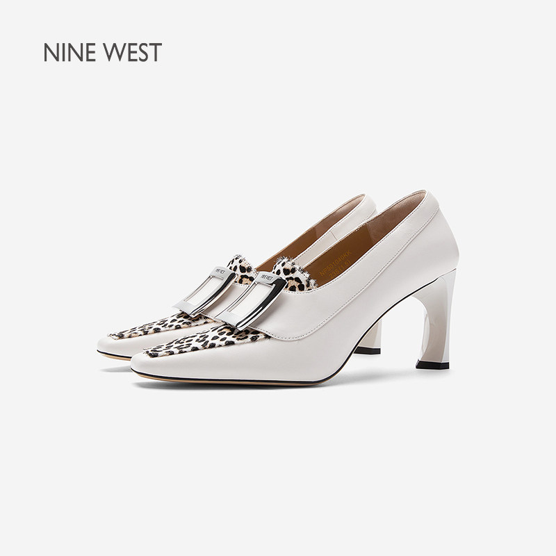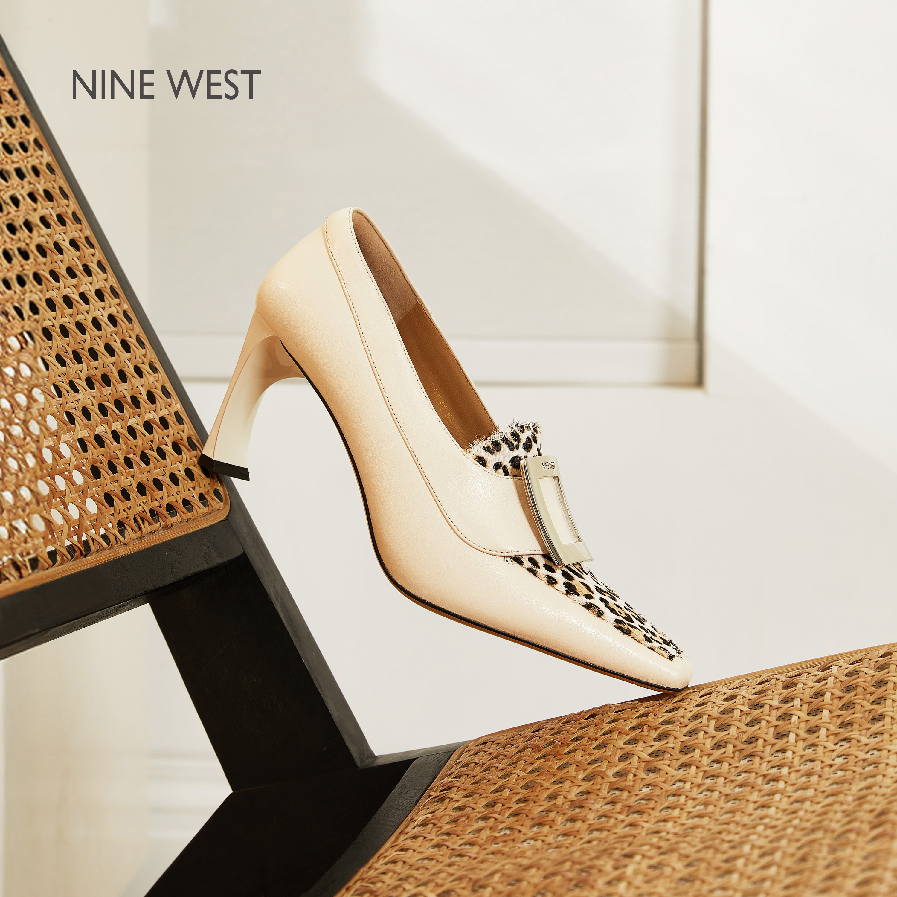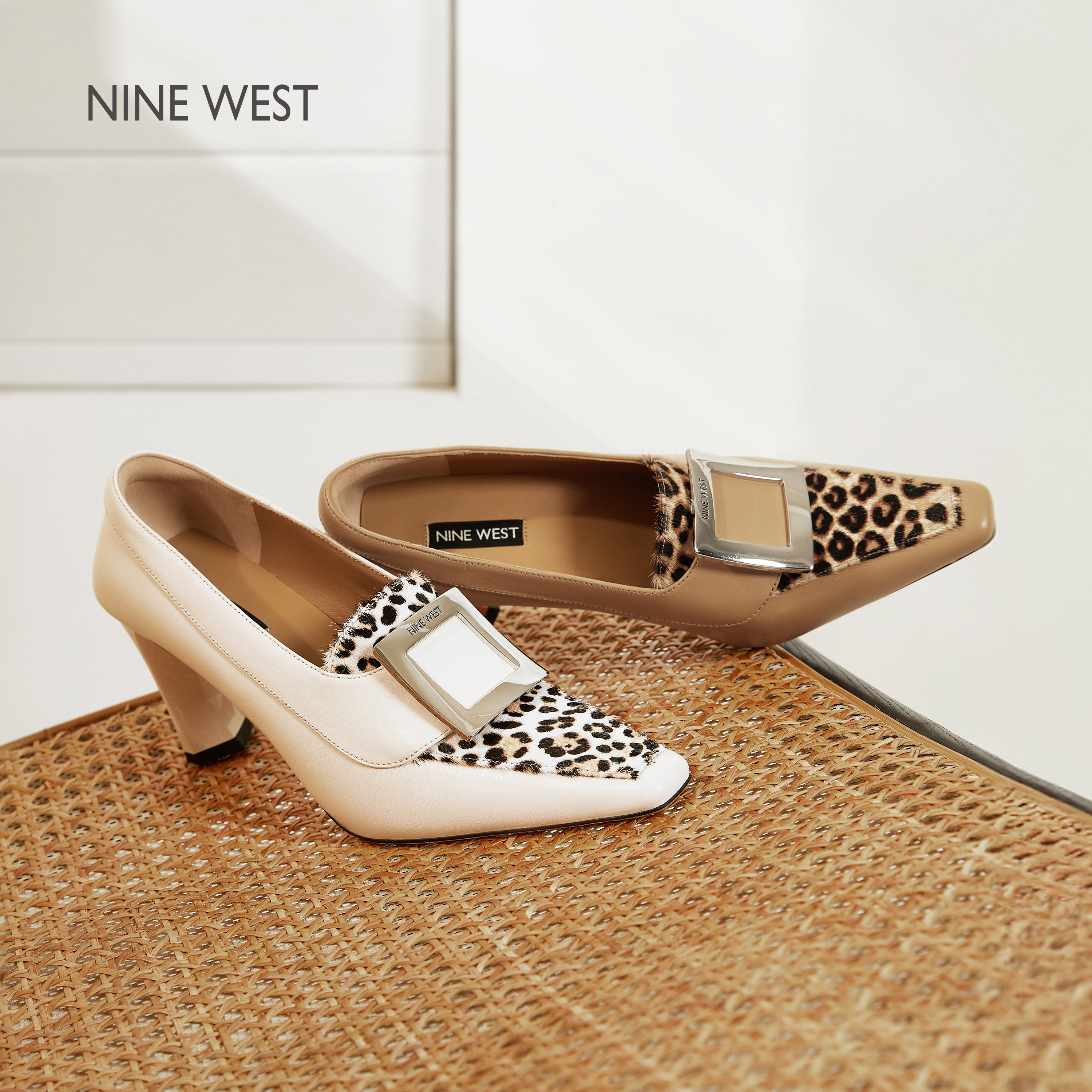 Nine West/玖熙商场同款豹纹高跟鞋女2025秋冬新款方扣真皮单鞋