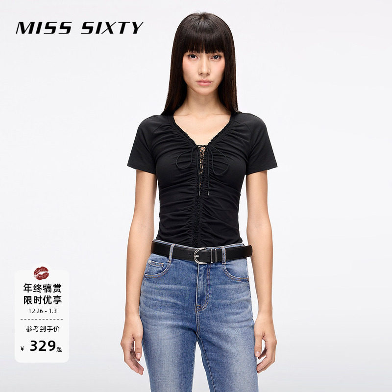 [修身]Miss Sixty2025夏季新款系带镂空短袖T恤短款设计感上衣