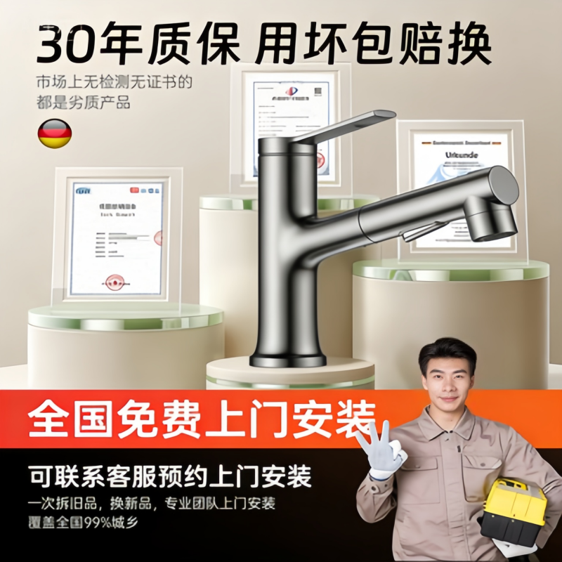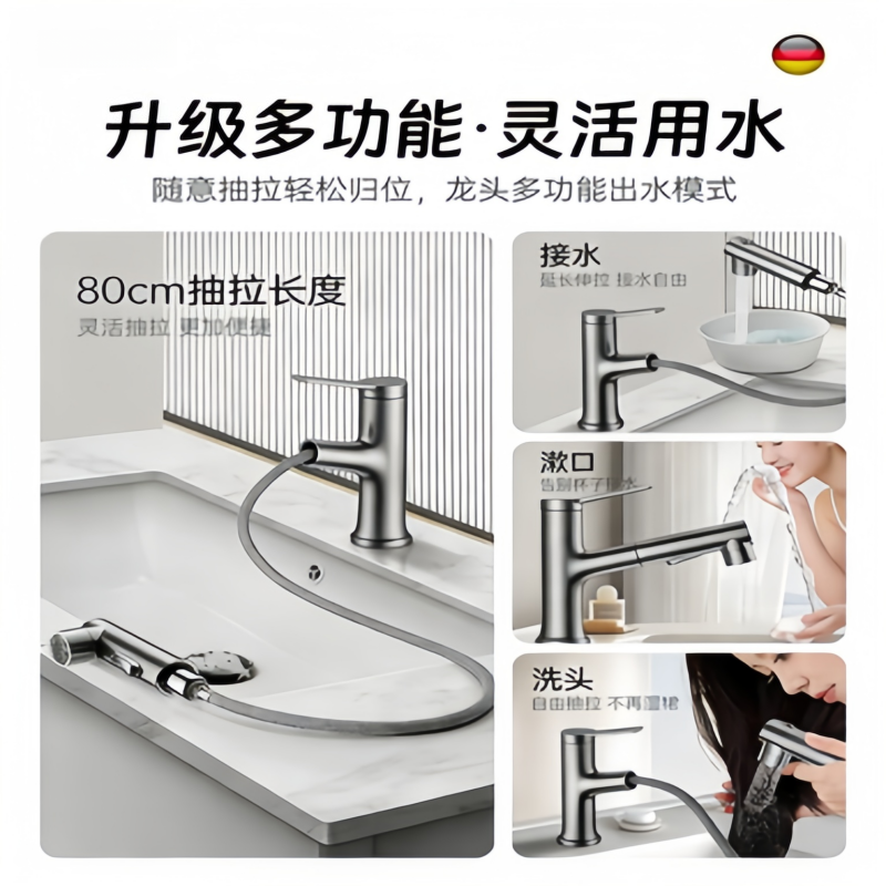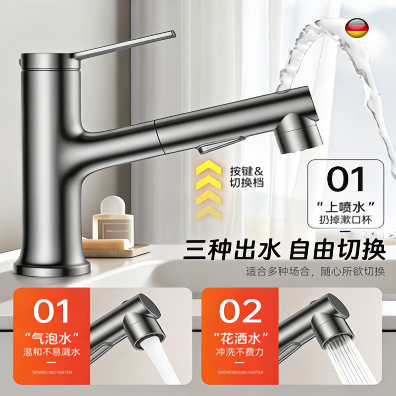 精铜抽拉式水龙头台上盆面盆洗脸盆冷热水龙头洗手盆浴室柜台上盆