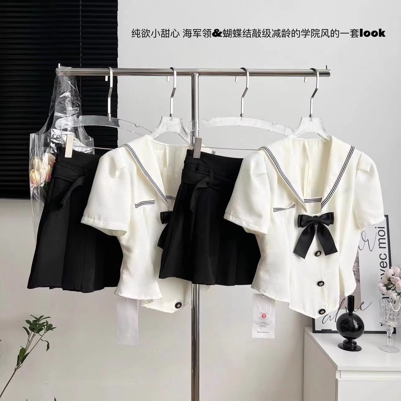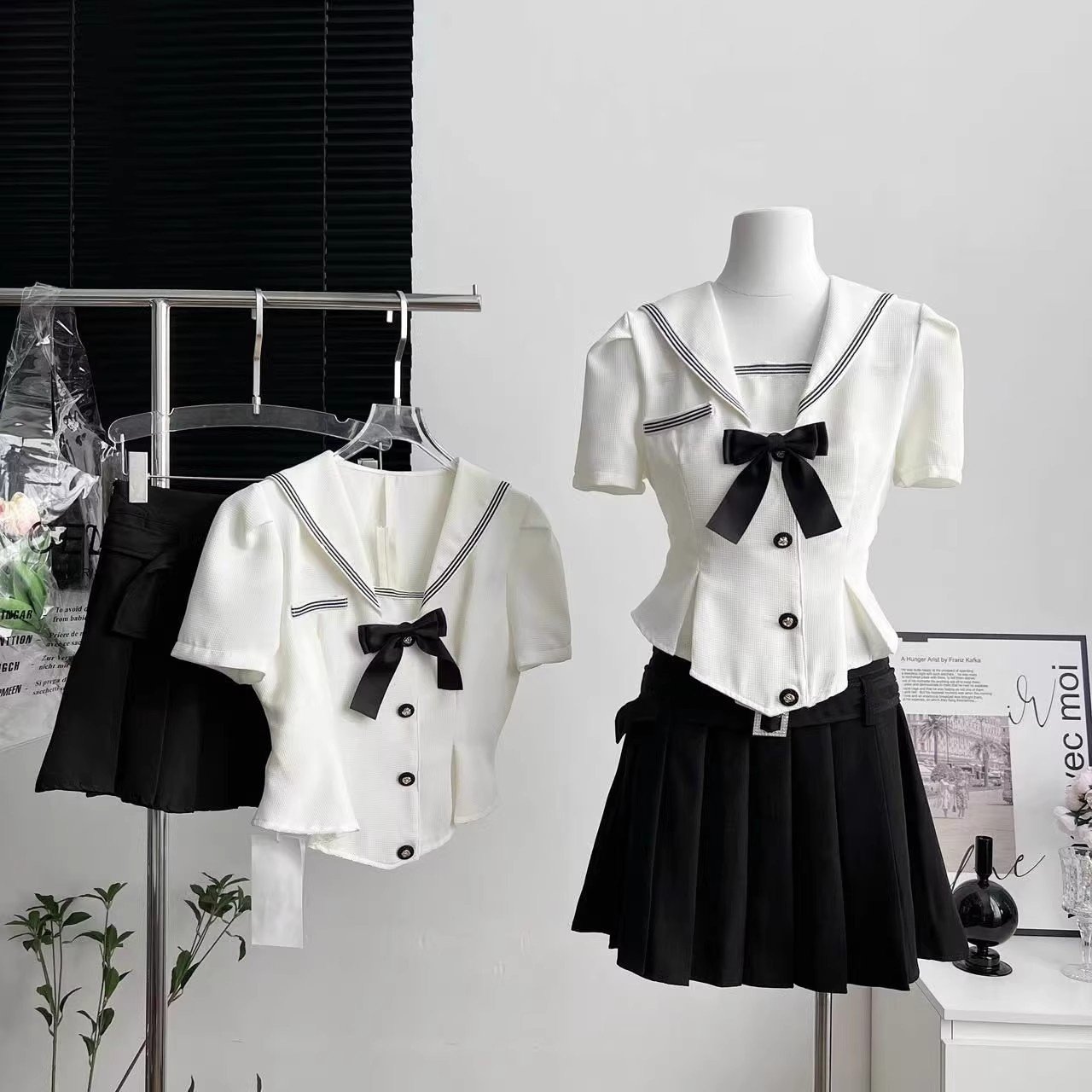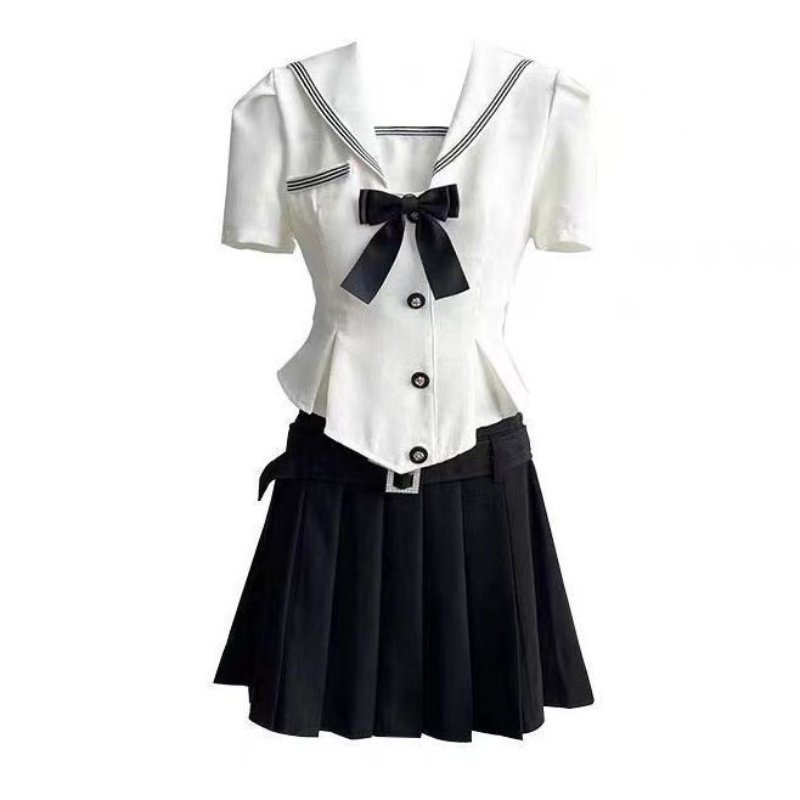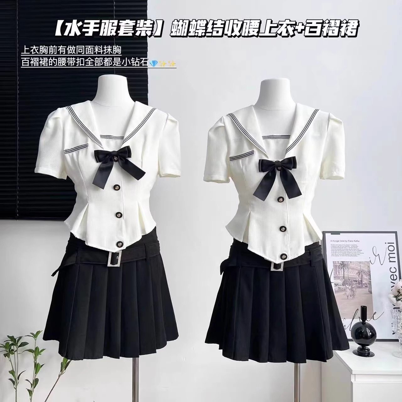 大码学院风jk制服水手服上衣夏季小个子黑色百褶裙甜辣妹两件套装