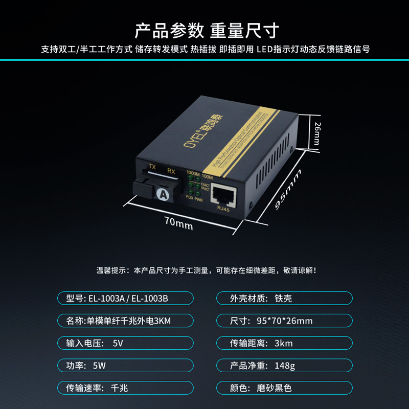 联鸿泰 单模单纤千兆光纤收发器1光1电EL-1003A外置电源式光电转换器一光一电网络视频监控远距离一对装3km