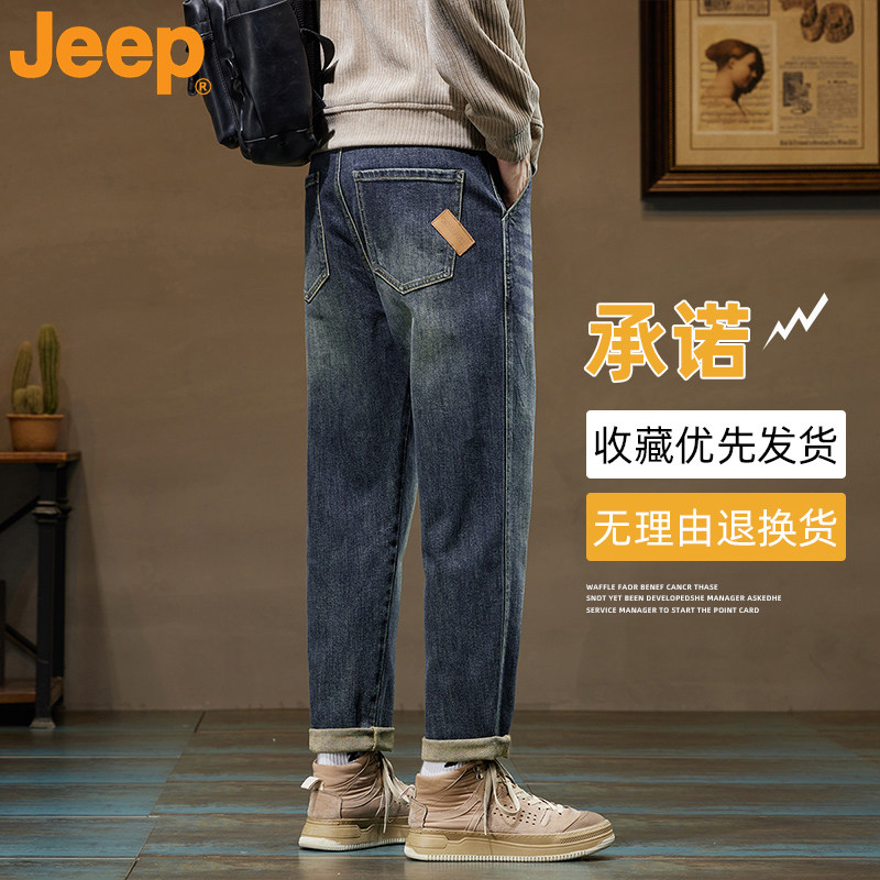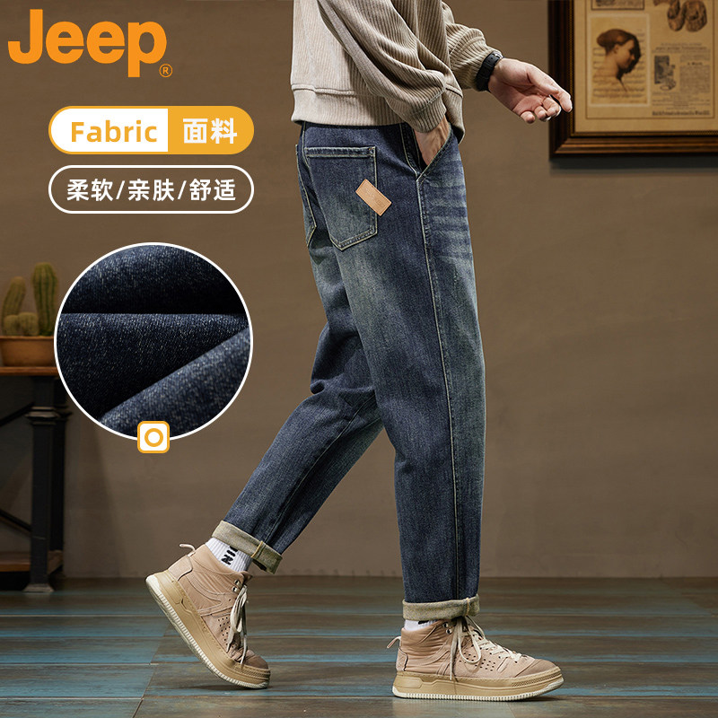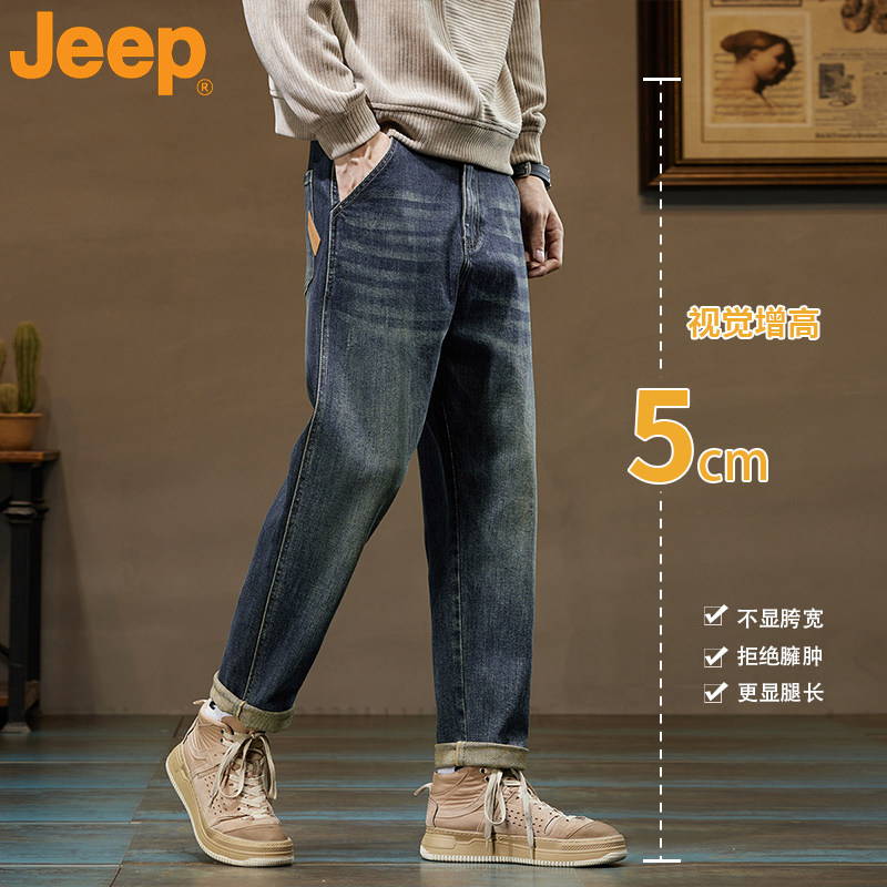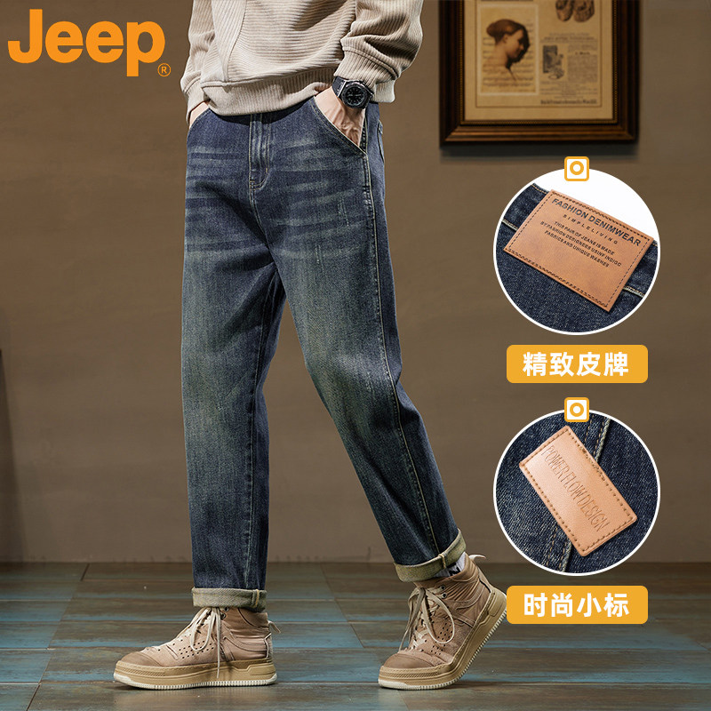 吉普专柜秋冬季新款复古牛仔裤男宽松直筒大码加绒加厚水洗长裤子