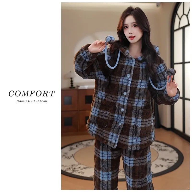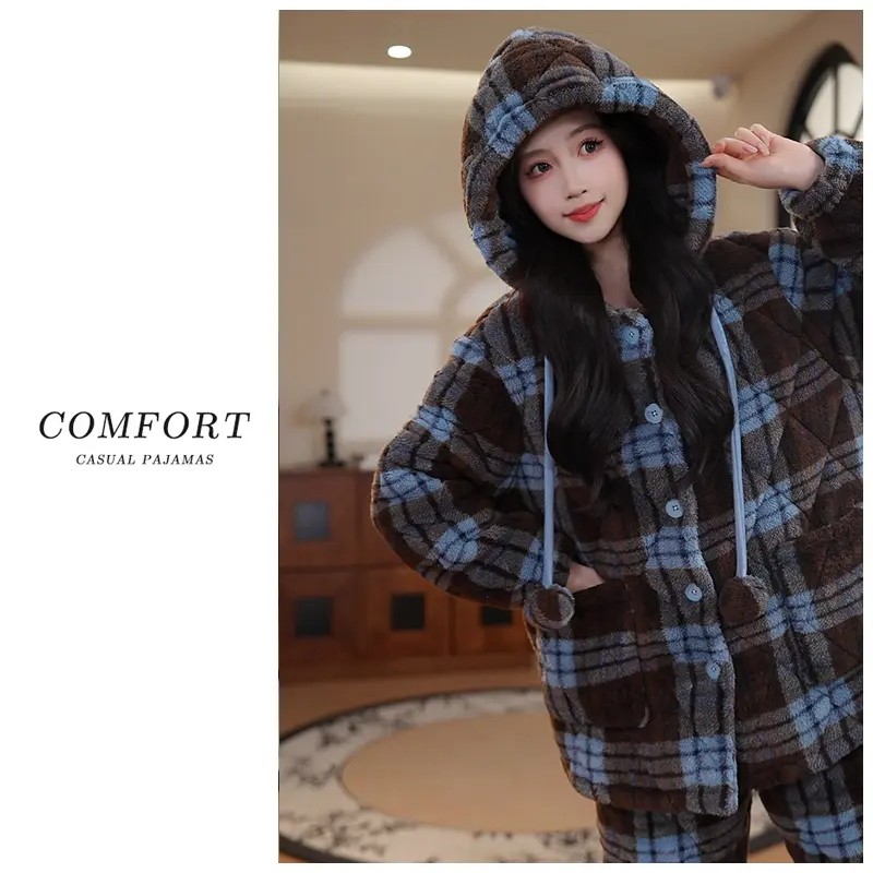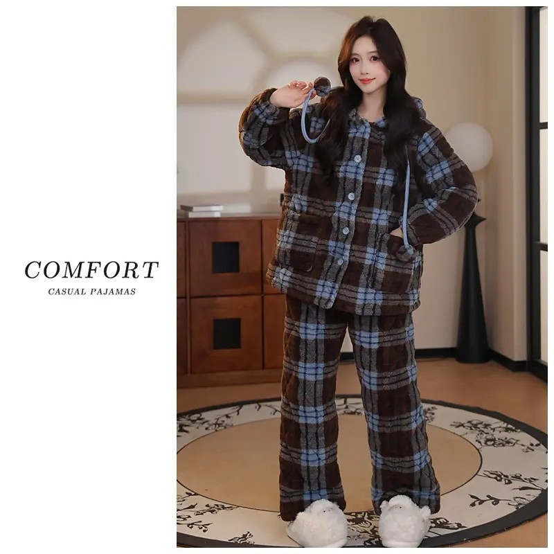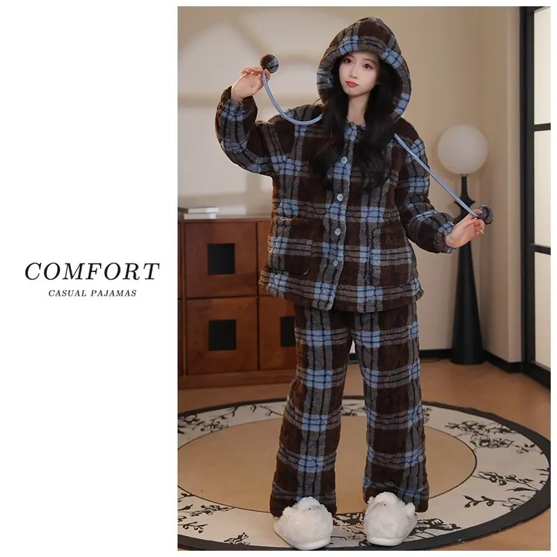 冬季新款格子三层夹棉加绒加厚睡衣长毛绒女保暖套装可外穿家居服