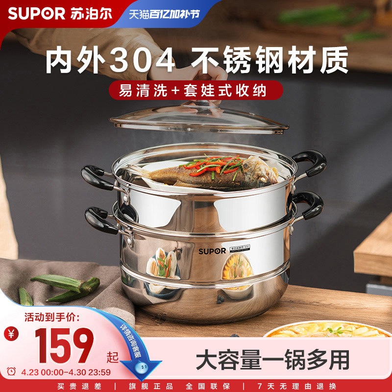 苏泊尔蒸锅家用2026新款304不锈钢蒸锅加厚多层蒸煮炖锅炉灶通用