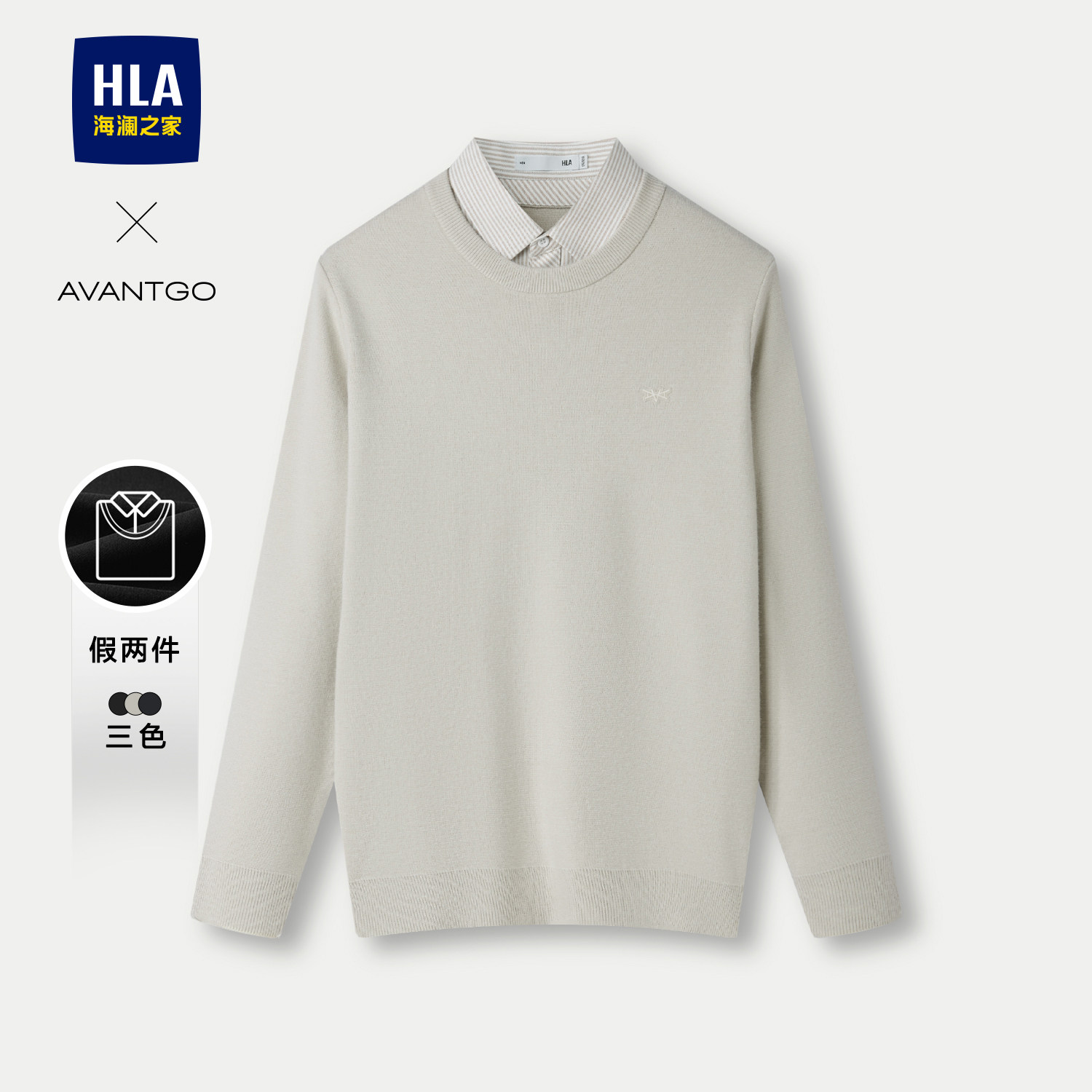 HLA/海澜之家轻商务加绒假两件针织衫25秋冬新黑色厚款双领毛衣男