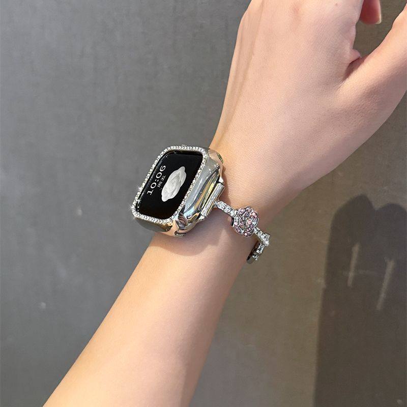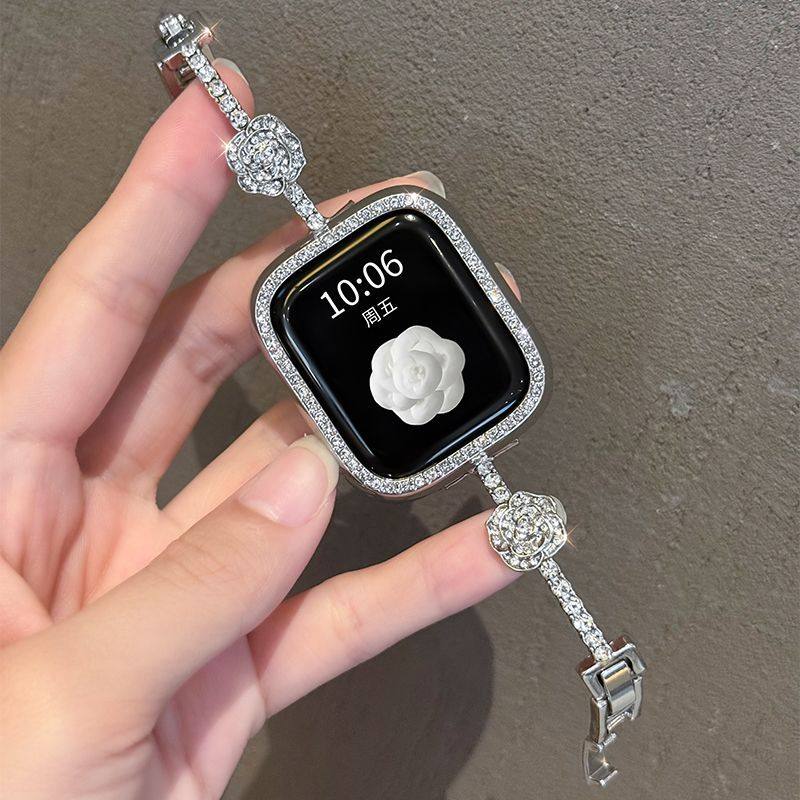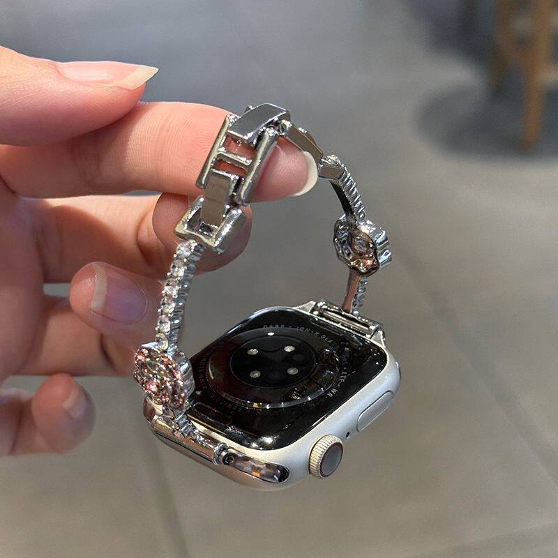 新款山茶花镶钻适用于苹果S10手表表带iwatchs9代轻奢s8高级s7s6seS5细金属4Ultra表链3女2链条1手镯手环银色