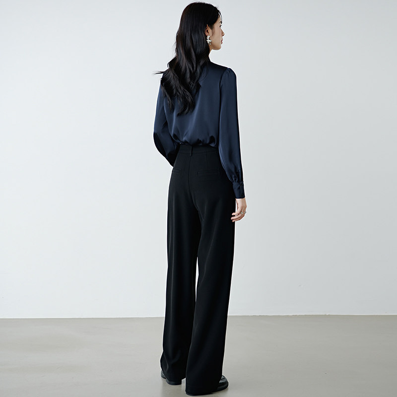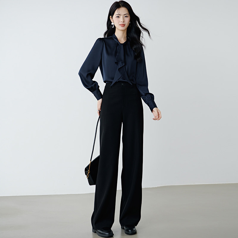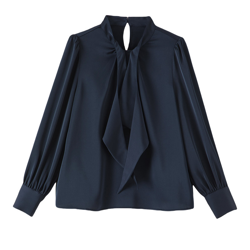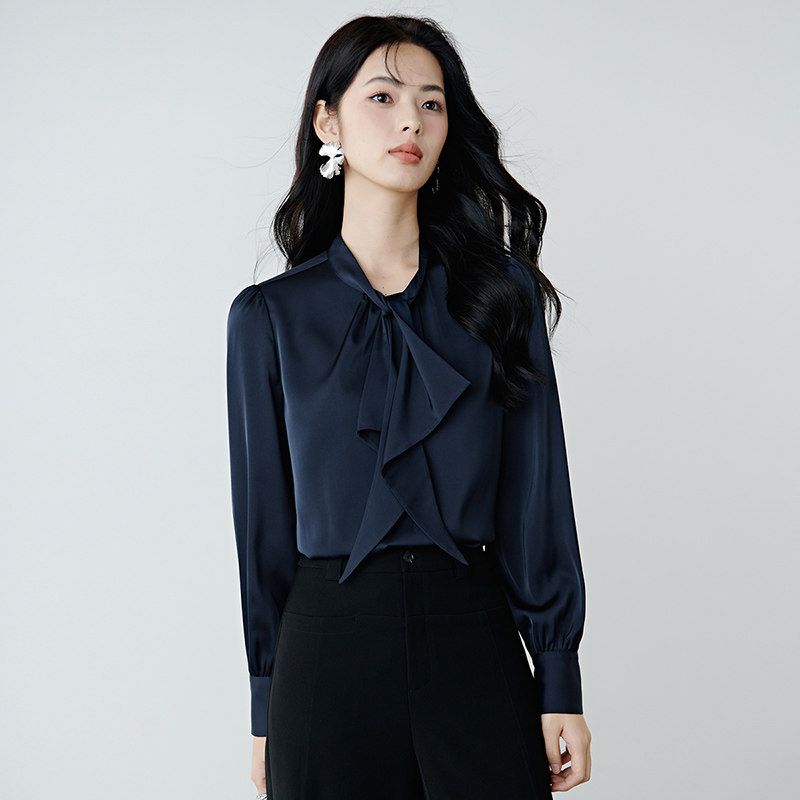 晚白2026年春新款气质法式行政蓝系带领衬衣缎面不易皱免烫衬衫女