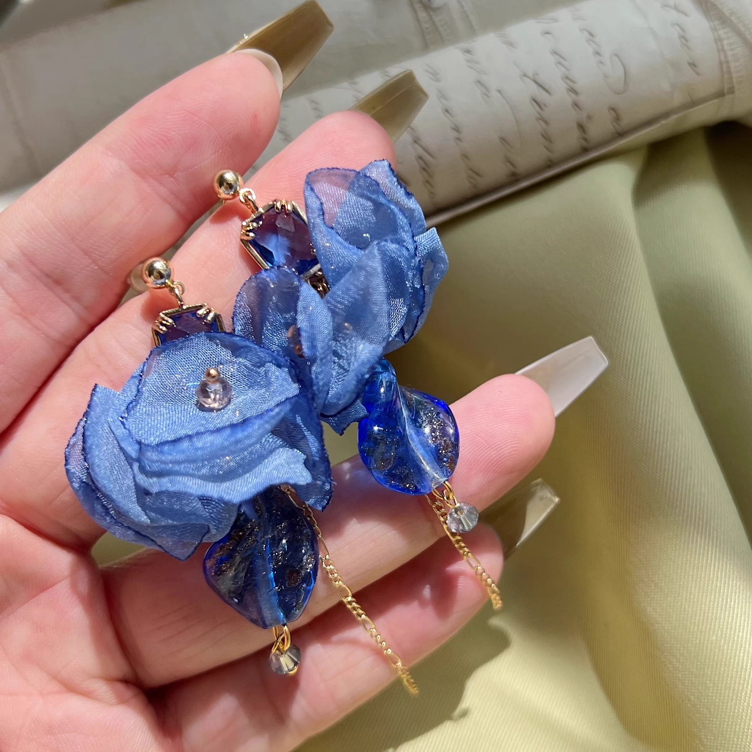 知更鸟|柔雾蓝海 原创复古春夏仙气新中式花朵长款水晶耳环耳夹