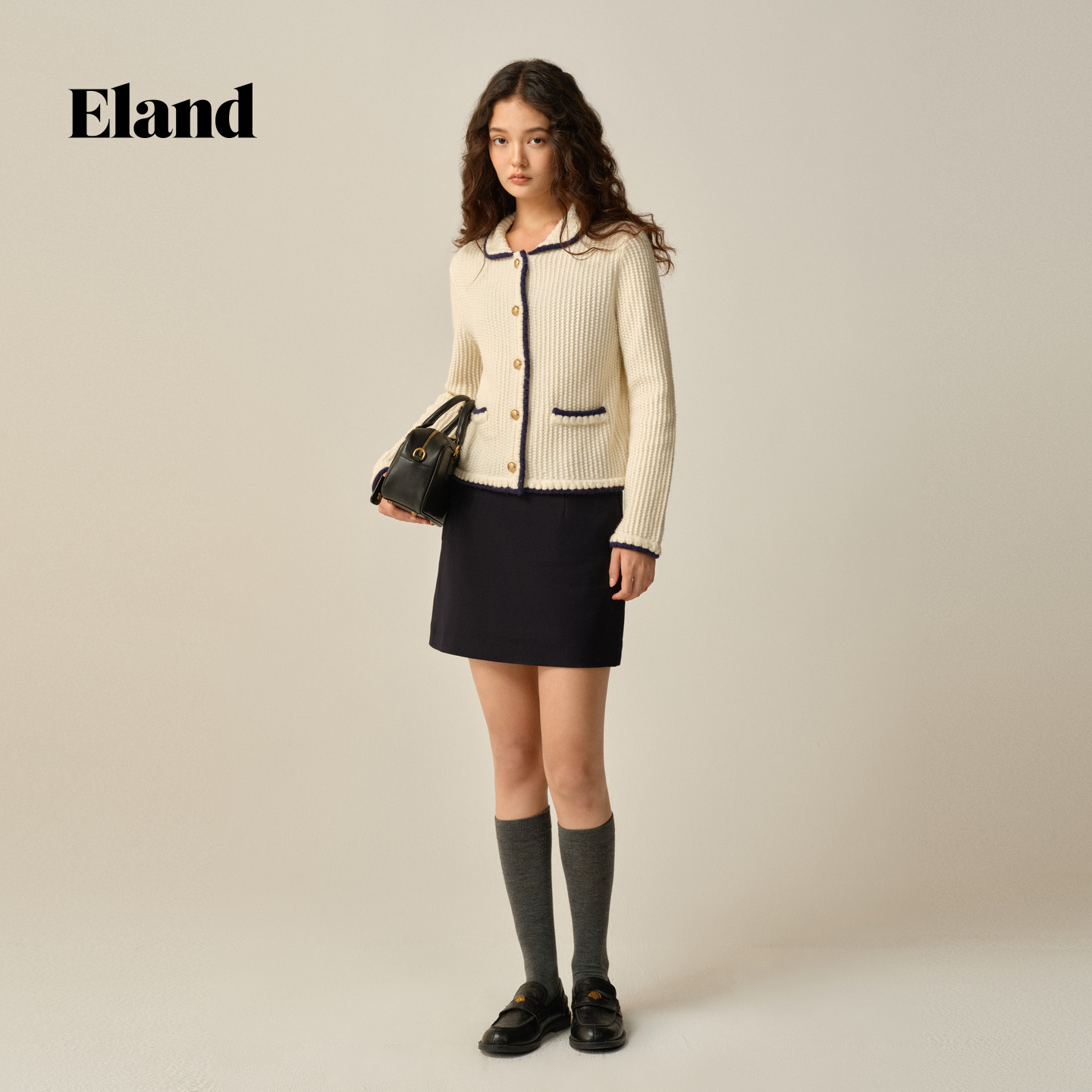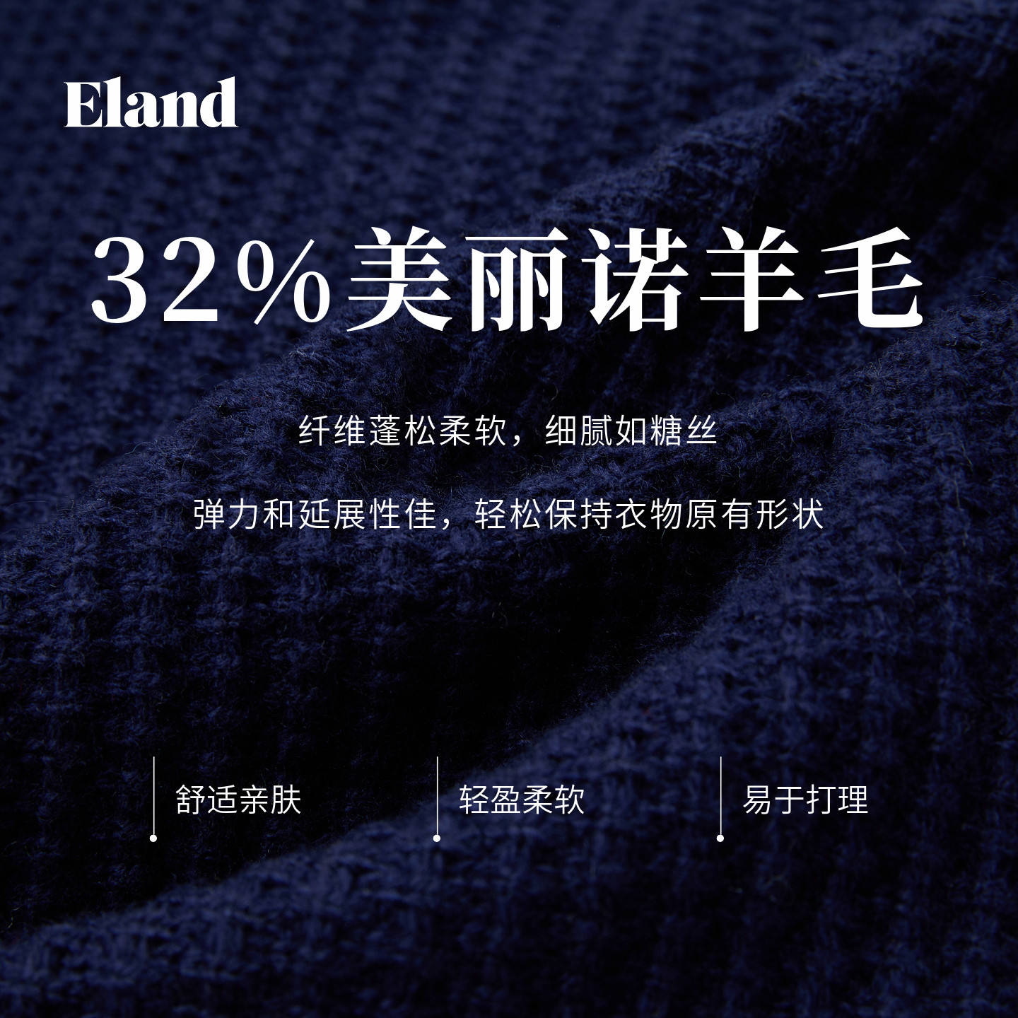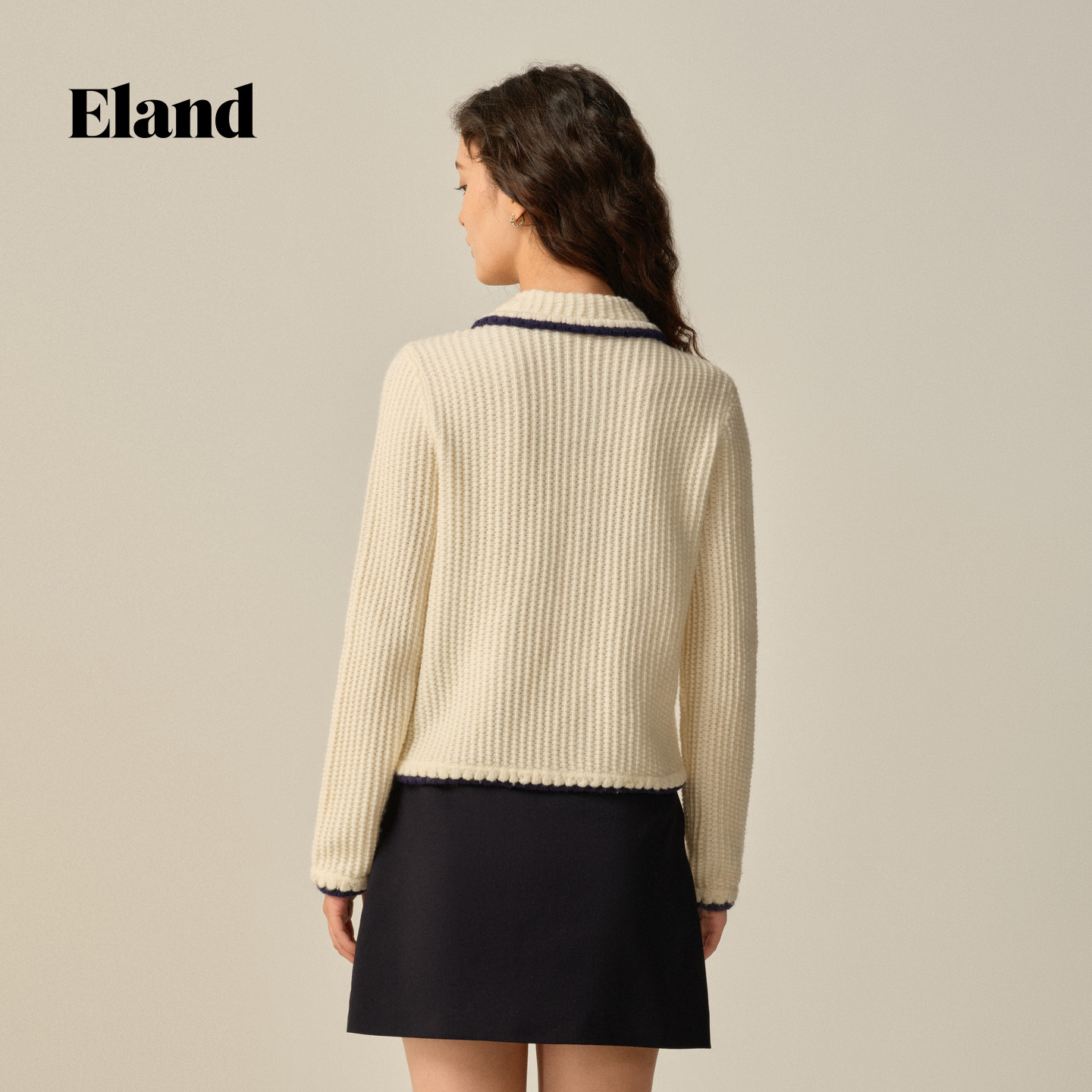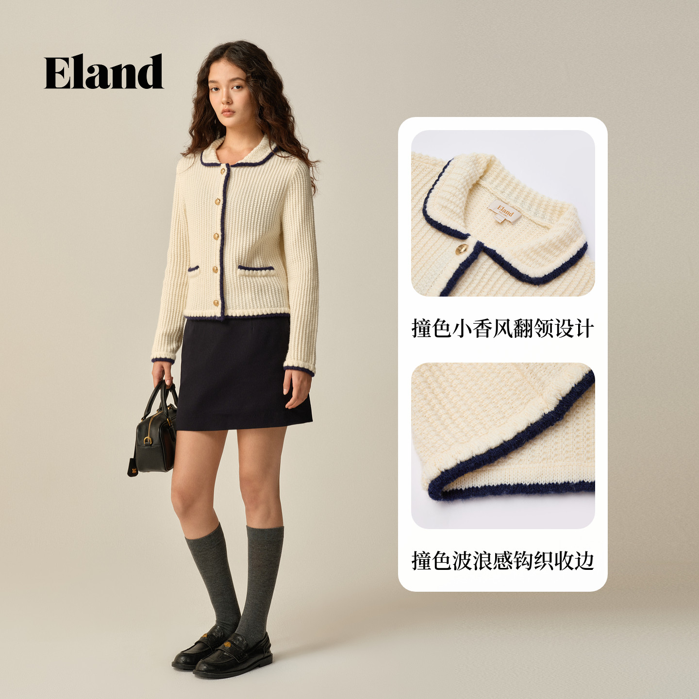 Eland衣恋毛针织衫女时尚撞色翻领开衫毛衣冬季新款
