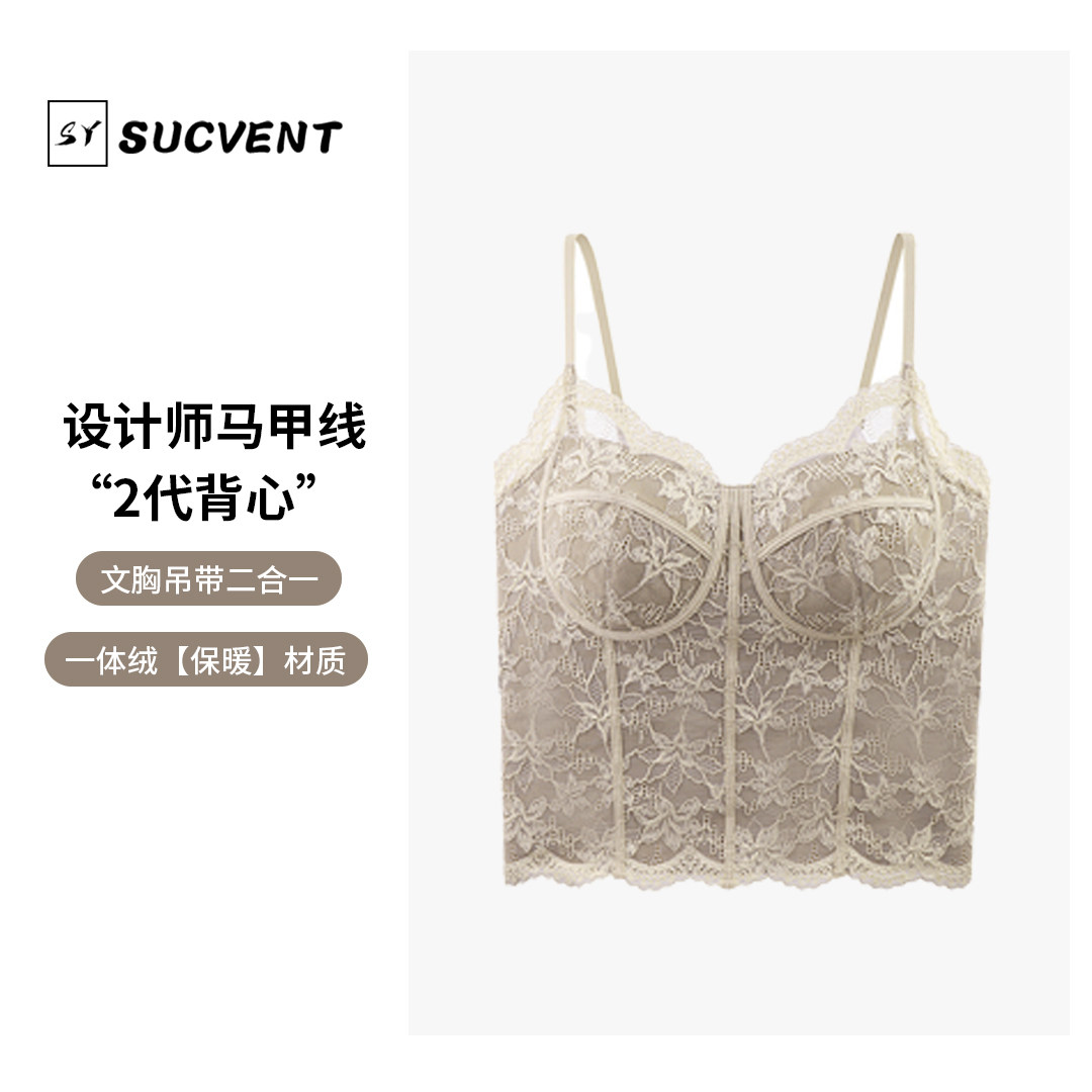 秋冬磨毛法式蕾丝纯欲吊带美背一体杯免穿文胸背心女修身显瘦保暖