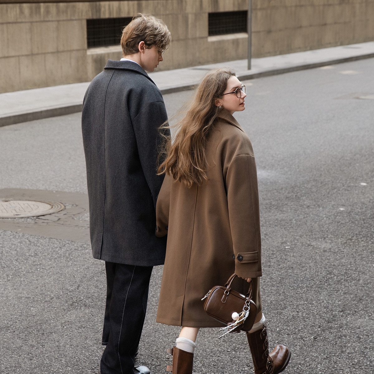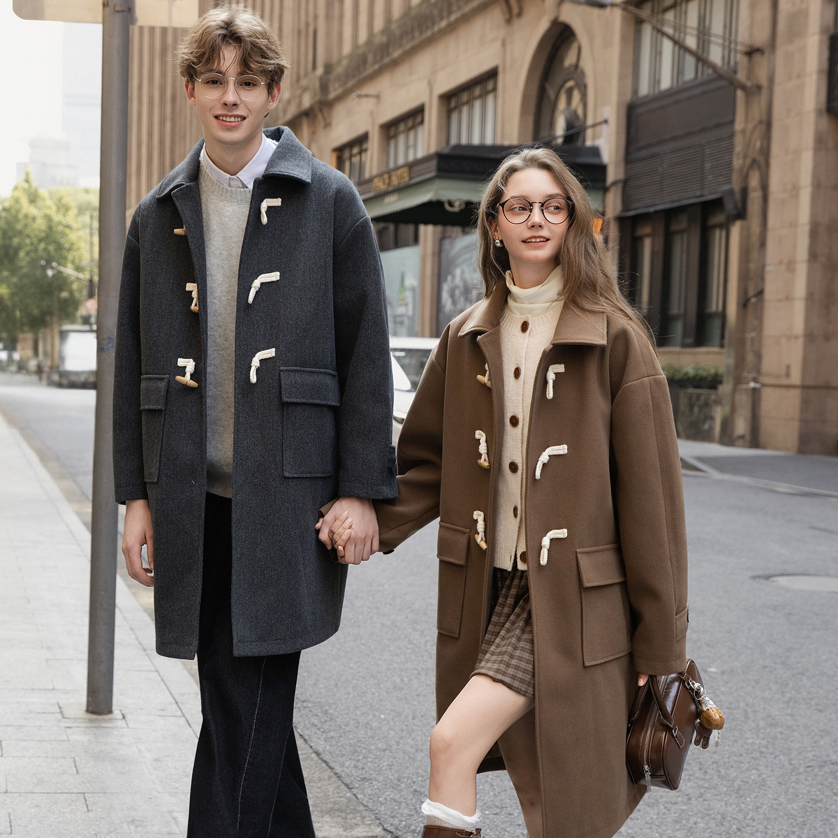 唐狮秋冬季中长款毛呢外套加厚情侣款翻领简约风仿牛角扣时尚TMTA