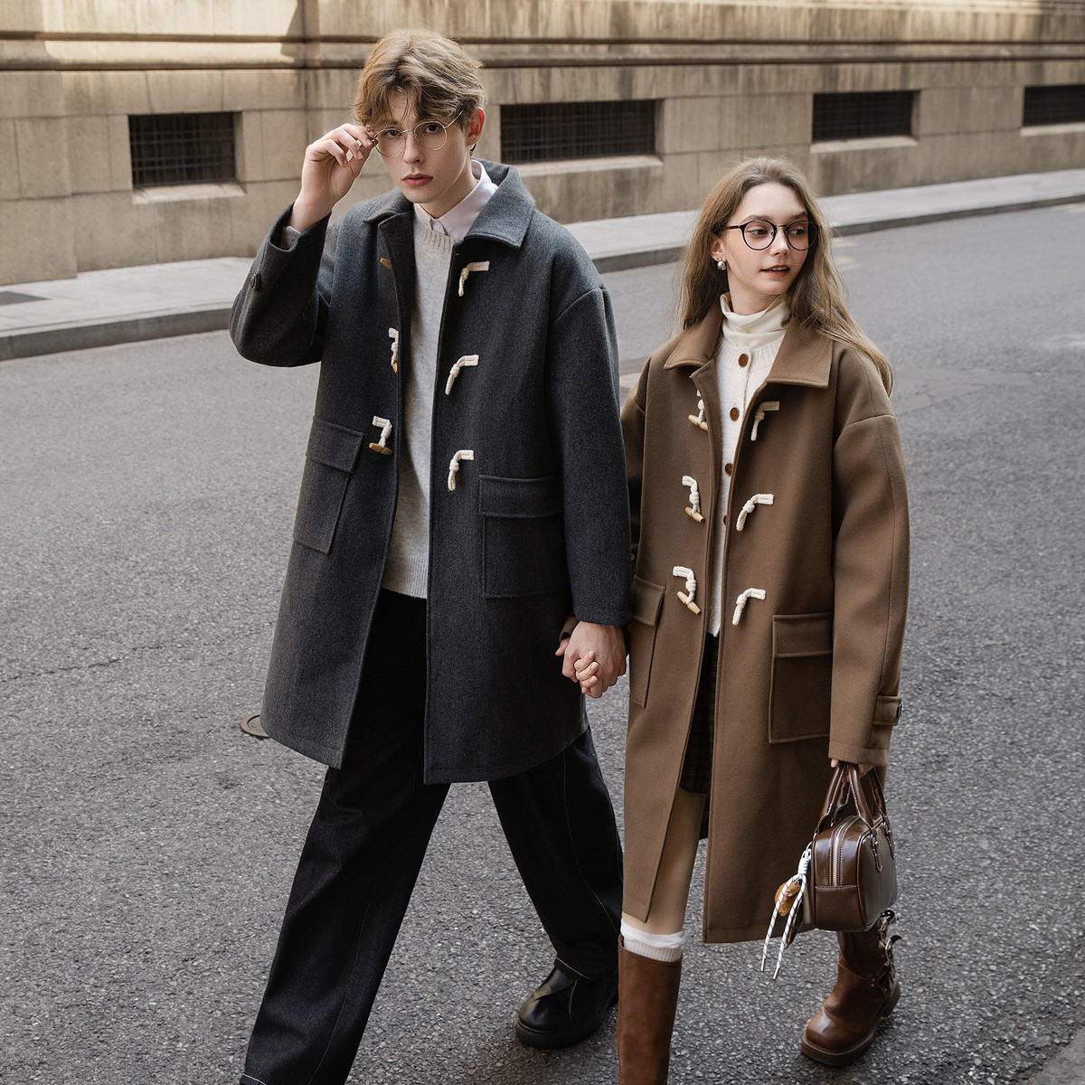 fmario【青春高校】羊毛牛角扣加厚连帽呢大衣男女韩版毛呢外套冬