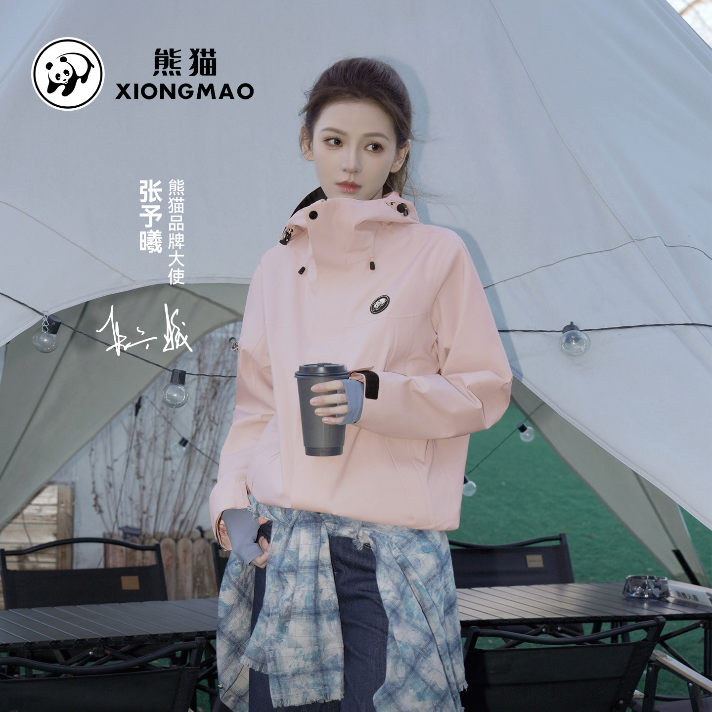 熊猫玩野户外粉色冲锋衣三合一户外休闲三防外套骑行宽松登山服女