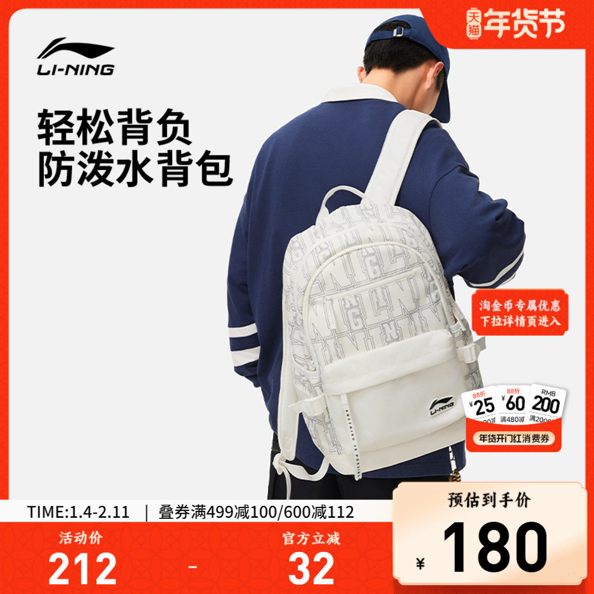 李宁双肩包男包女包新款运动生活系列背包学生书包户外出行运动包