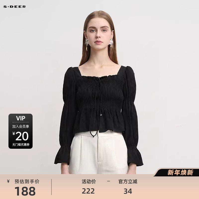 sdeer圣迪奥女装秋甜美方领肌理拼接系带长袖衬衫S241Z0509