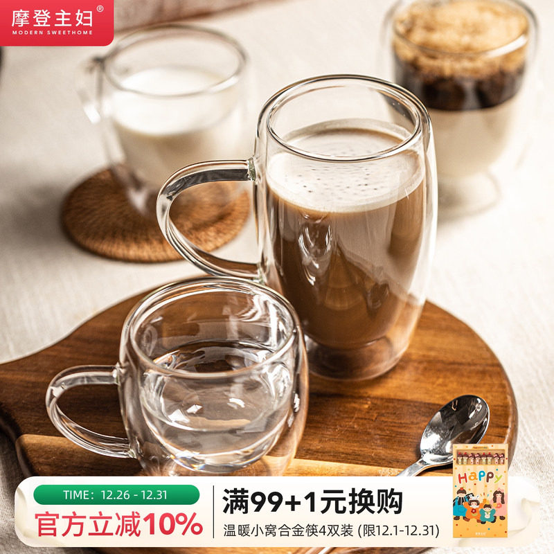 摩登主妇水杯家用早餐杯耐高温杯子女新款咖啡杯带把手双层玻璃杯