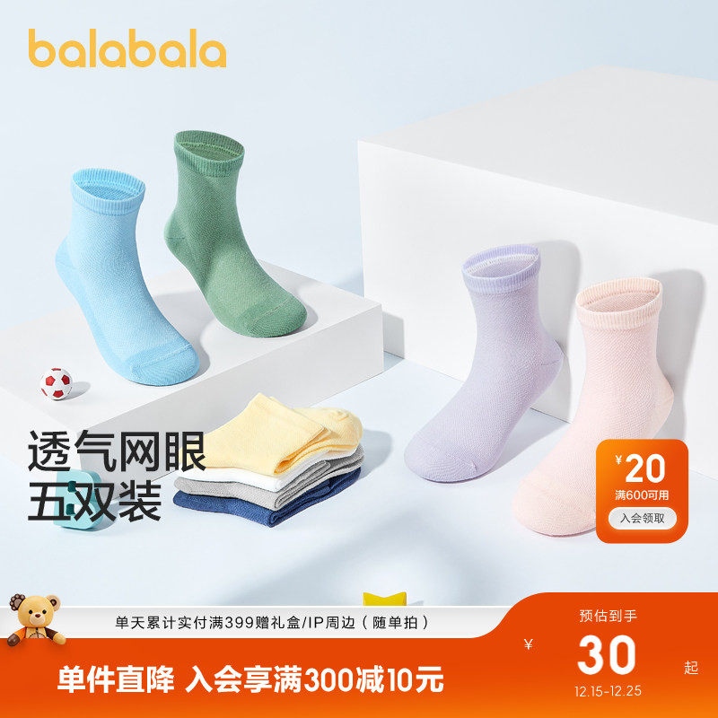 巴拉巴拉儿童袜子夏装网眼儿童学生袜透气男童女童小童宝宝五双装