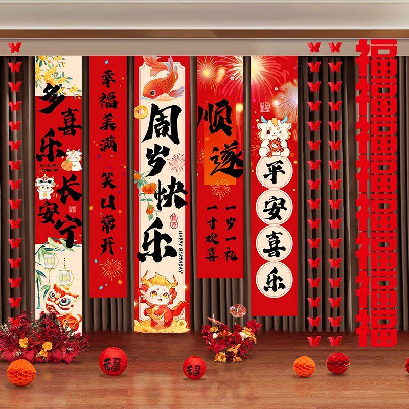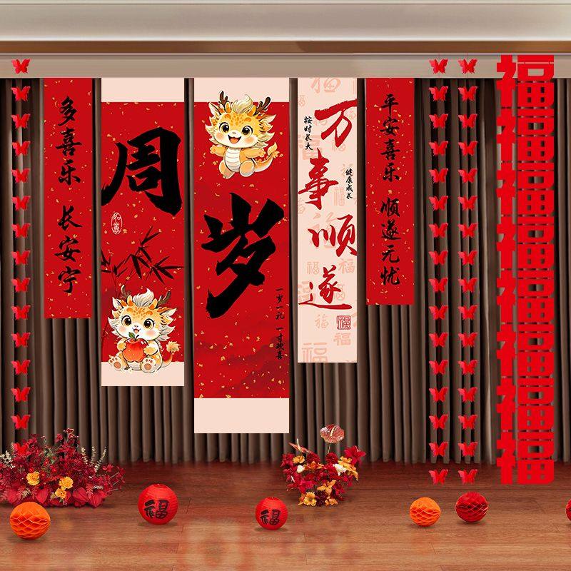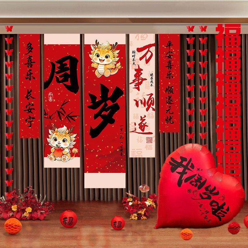 龙宝宝周岁挂布条幅生日布置背景墙男孩女孩道具爱心气球一岁