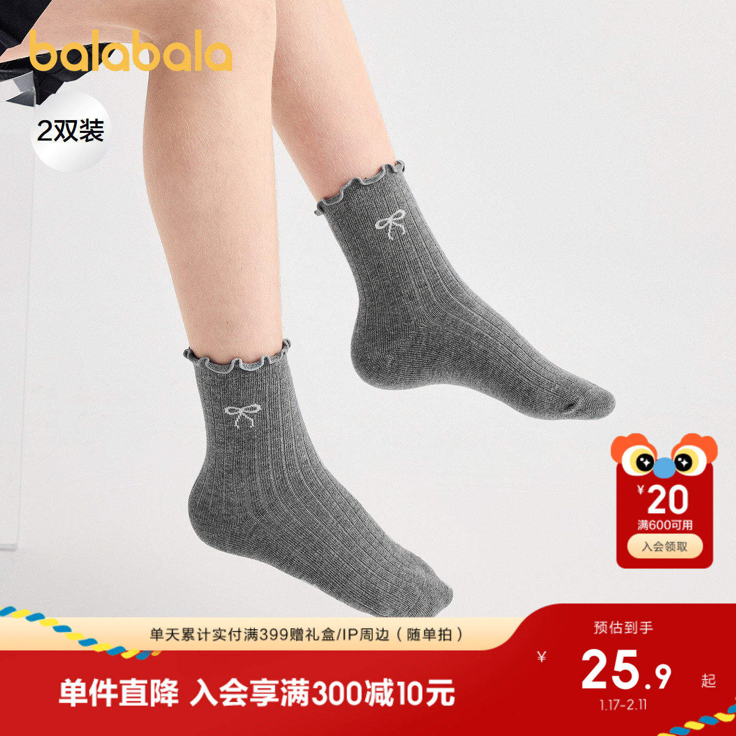 巴拉巴拉女童袜子秋新品儿童提花袜不勒脚甜美两双装