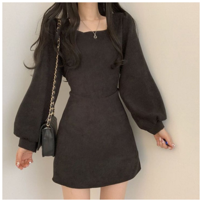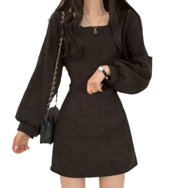 iqcq气球熊时尚辣妹套装秋季抹胸连衣裙女收腰一字肩黑色蓬蓬裙子