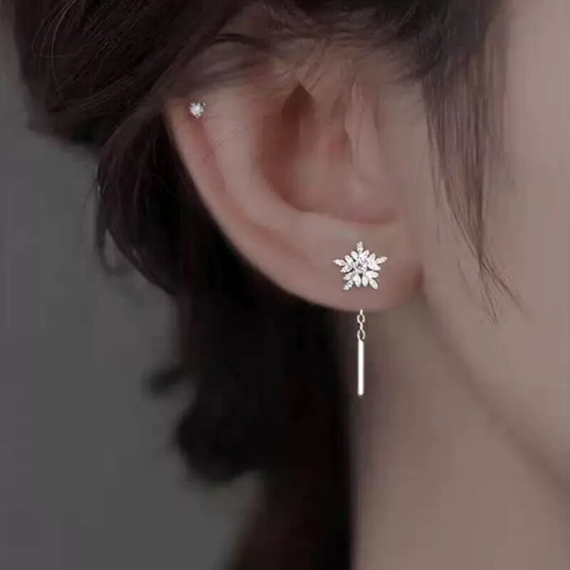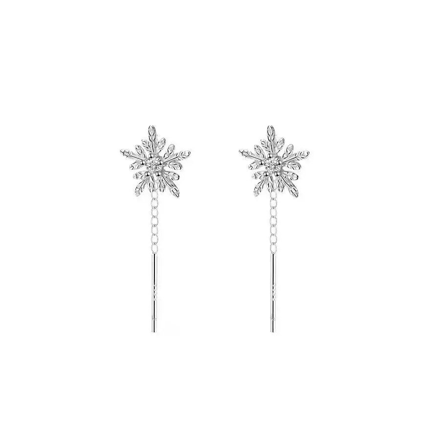 S999纯银针镶钻雪花耳线秋冬季新款时尚百搭气质流苏耳饰品耳环