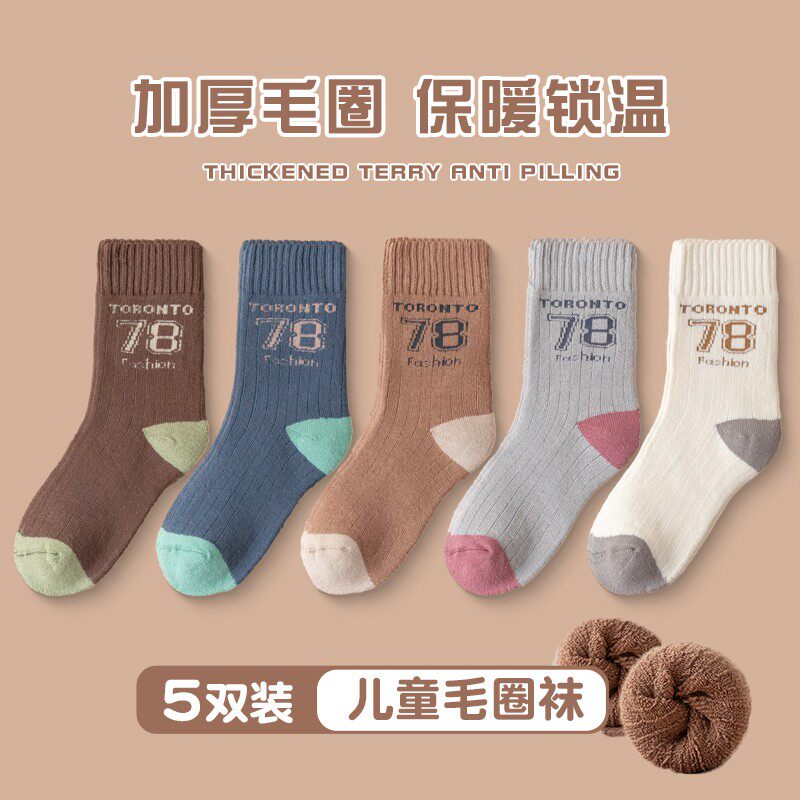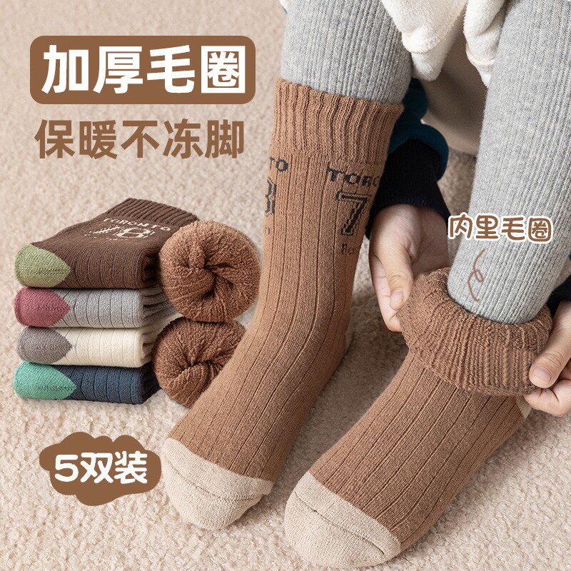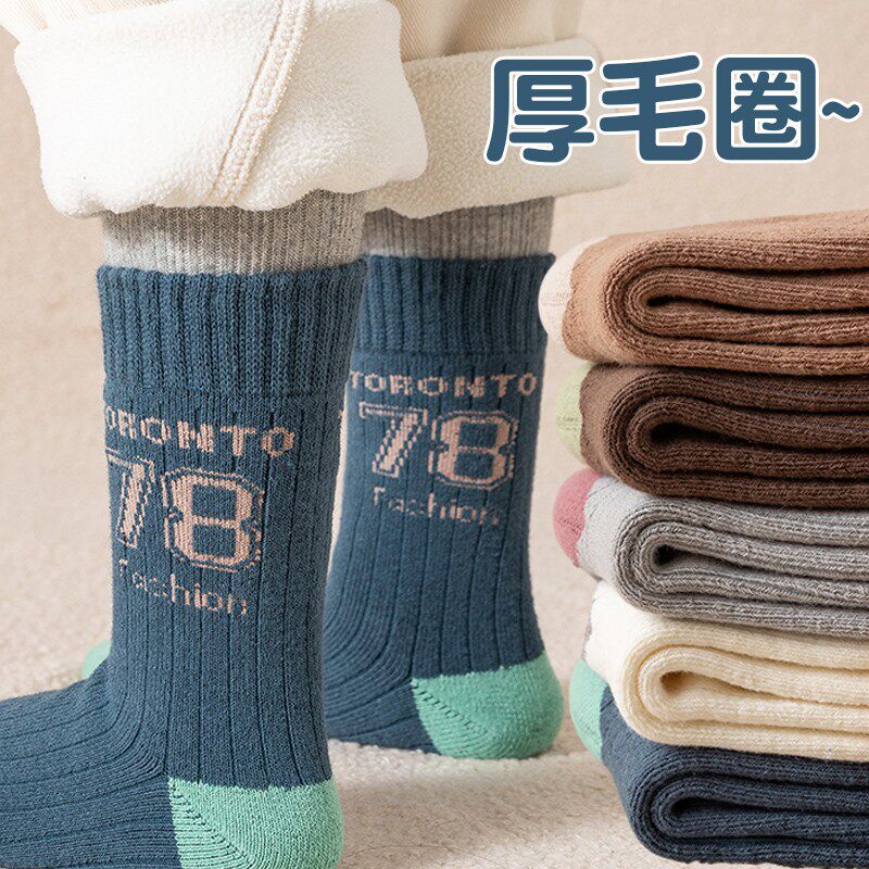 冬季男童袜子加厚保暖毛圈袜中大童字母学生潮秋冬加绒童袜男女孩