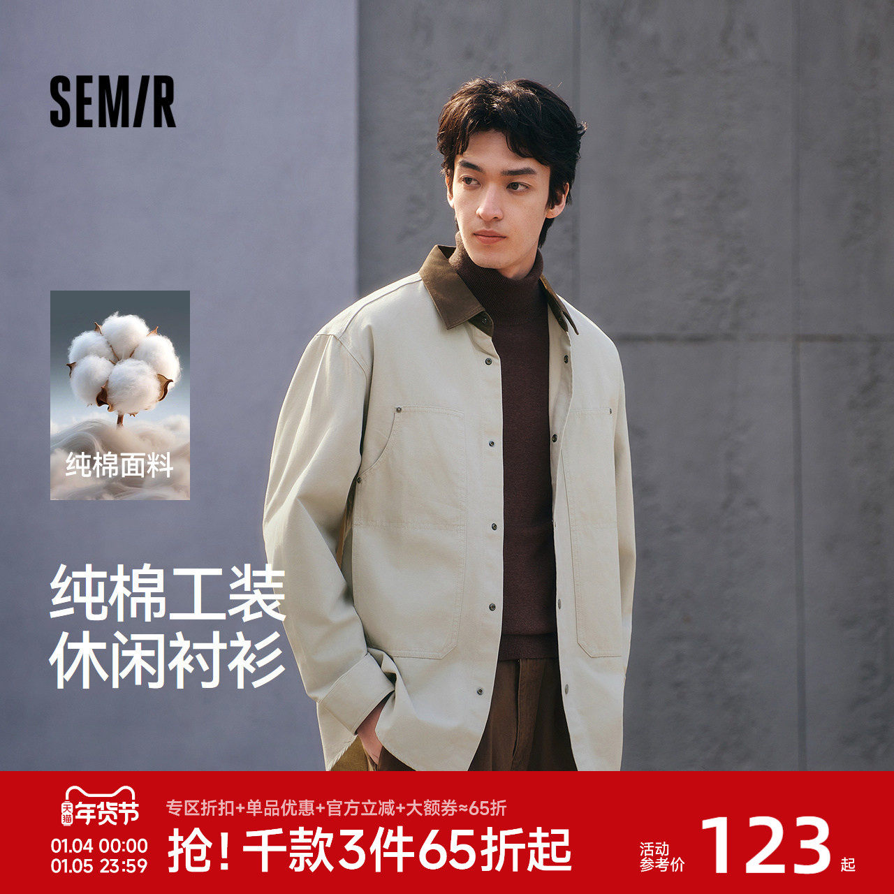 森马长袖衬衫男春季撞色宽松翻领上衣纯棉工装四合扣口袋水洗外套